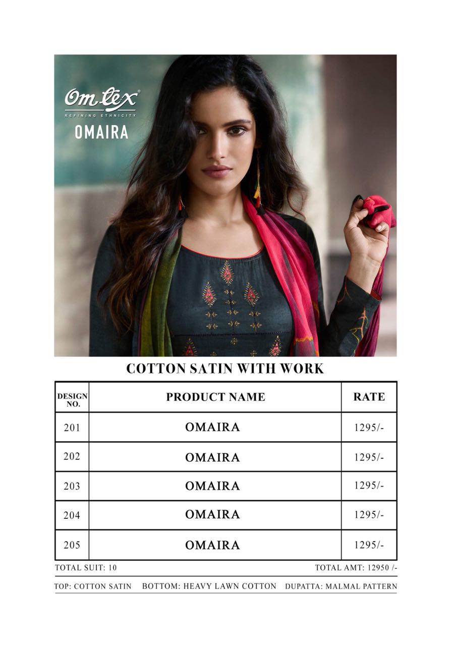 Buy Online Omaira By Omtex Satin Cotton Embroidered Desinger Party Wear Suits Wholesale Supplier And Dealer Gujarat 10 Pcs of Full Catalogue at Wholesale Price. Looking for Omaira By Omtex Satin Cotton Embroidered Desinger Party Wear Suits Wholesale Supplier And Dealer Gujarat Full Catalouge at Best Price? Buy Now Omaira By Omtex Satin Cotton Embroidered Desinger Party Wear Suits Wholesale Supplier And Dealer Gujarat at Wholesale Rate of Rs 12950 with Total 10 Pcs from authroized dealer and supplier of OM TEX Brand. Cost of Each piece is just only Rs 1295 which is very low and affordable price to resale the product in your retail store ,This is Surat based Wholesale Supplier & Dealer of OM TEX Brand. Click on Brand name to Know more about OM TEX Brand's products.Call or Whatsapp on 9898838984 for booking or enquiry