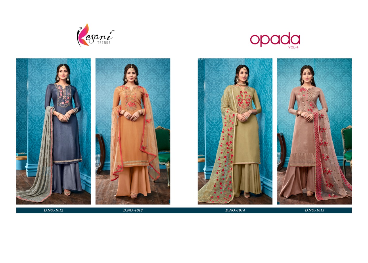 Buy Online Opada Vol 4 By Kesari Trendz 1012 Series Fancy Pure Viscose Upada Silk Salwar Kameez Catlog Wholesale Dealer Surat 4 Pcs of Full Catalogue at Wholesale Price. Looking for Opada Vol 4 By Kesari Trendz 1012 Series Fancy Pure Viscose Upada Silk Salwar Kameez Catlog Wholesale Dealer Surat Full Catalouge at Best Price? Buy Now Opada Vol 4 By Kesari Trendz 1012 Series Fancy Pure Viscose Upada Silk Salwar Kameez Catlog Wholesale Dealer Surat at Wholesale Rate of Rs 5800 with Total 4 Pcs from authroized dealer and supplier of KESARI TRENDZ Brand. Cost of Each piece is just only Rs 1450 which is very low and affordable price to resale the product in your retail store ,This is Surat based Wholesale Supplier & Dealer of KESARI TRENDZ Brand. Click on Brand name to Know more about KESARI TRENDZ Brand's products.Call or Whatsapp on 9898838984 for booking or enquiry