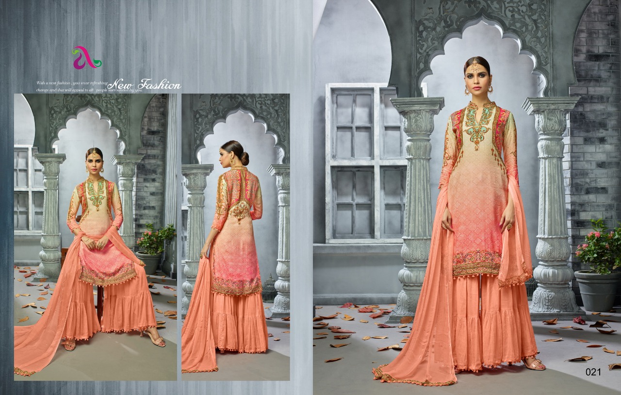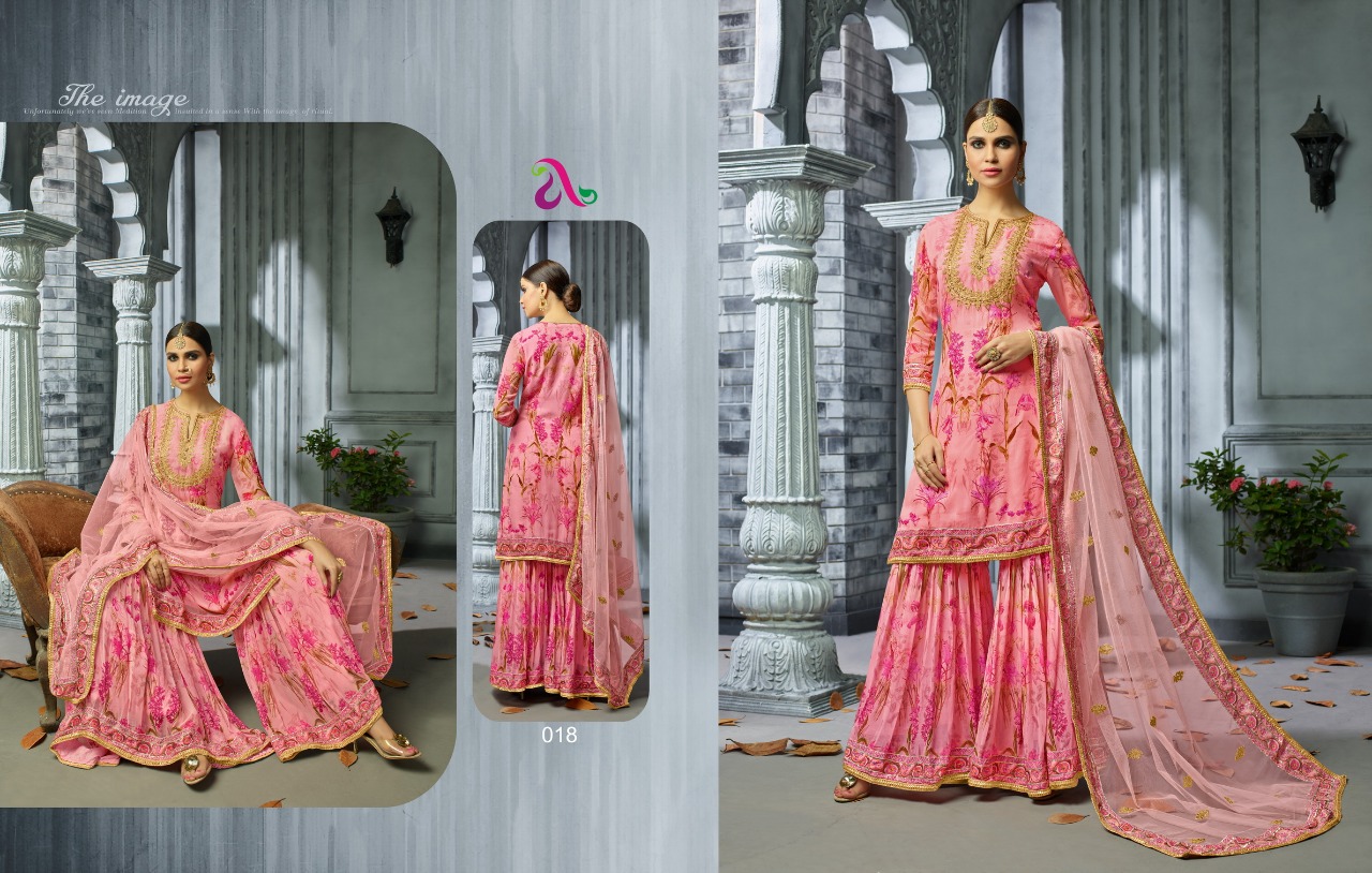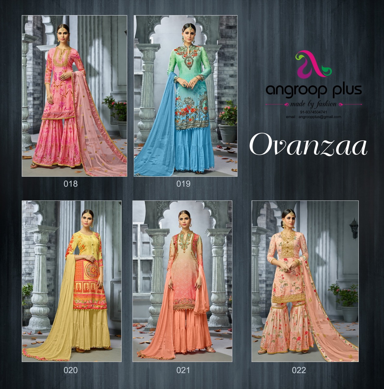 Buy Online Ovanzaa By Angroop Plus 018 Series Designer Sarara Suit Catlog Wholesale Dealer And Supplier Surat 5 Pcs of Full Catalogue at Wholesale Price. Looking for Ovanzaa By Angroop Plus 018 Series Designer Sarara Suit Catlog Wholesale Dealer And Supplier Surat Full Catalouge at Best Price? Buy Now Ovanzaa By Angroop Plus 018 Series Designer Sarara Suit Catlog Wholesale Dealer And Supplier Surat at Wholesale Rate of Rs 5475 with Total 5 Pcs from authroized dealer and supplier of ANGROOP PLUS Brand. Cost of Each piece is just only Rs 1095 which is very low and affordable price to resale the product in your retail store ,This is Surat based Wholesale Supplier & Dealer of ANGROOP PLUS Brand. Click on Brand name to Know more about ANGROOP PLUS Brand's products.Call or Whatsapp on 9898838984 for booking or enquiry