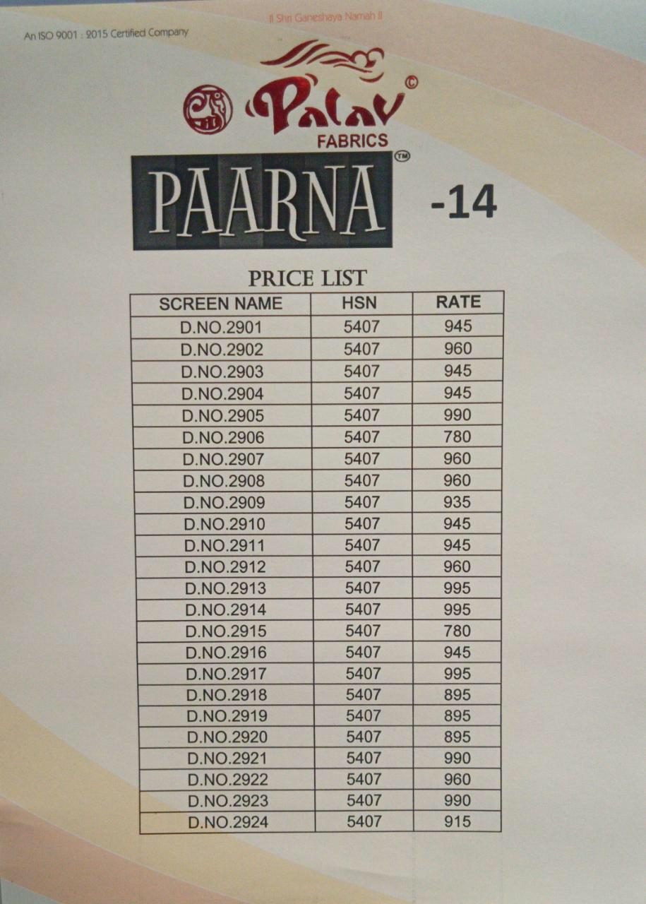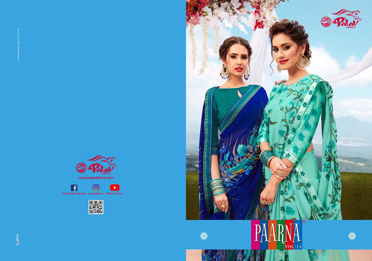 Brand - Palav . Type - Saree. Catlog Name - PAARNA -14. Set & loose . Single extra 100 GST 5 Percent Extra. Delivery 3-4 days |