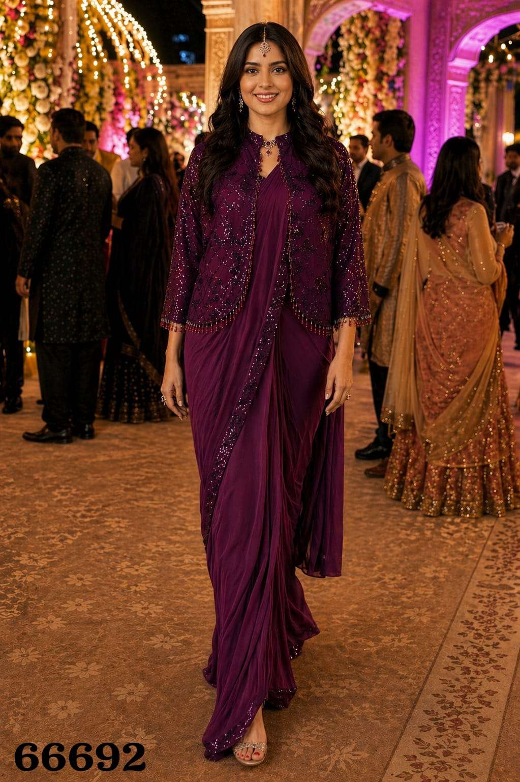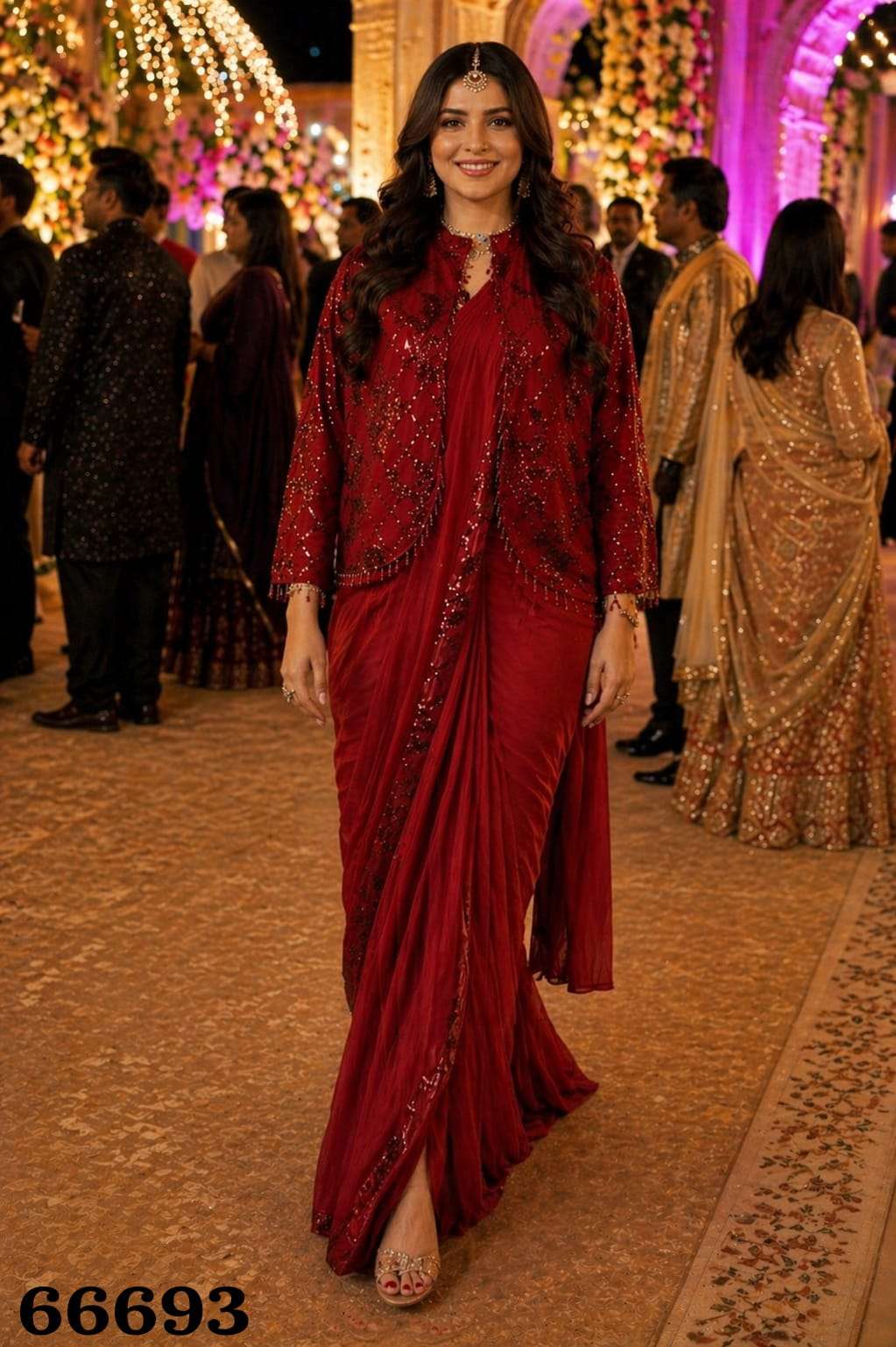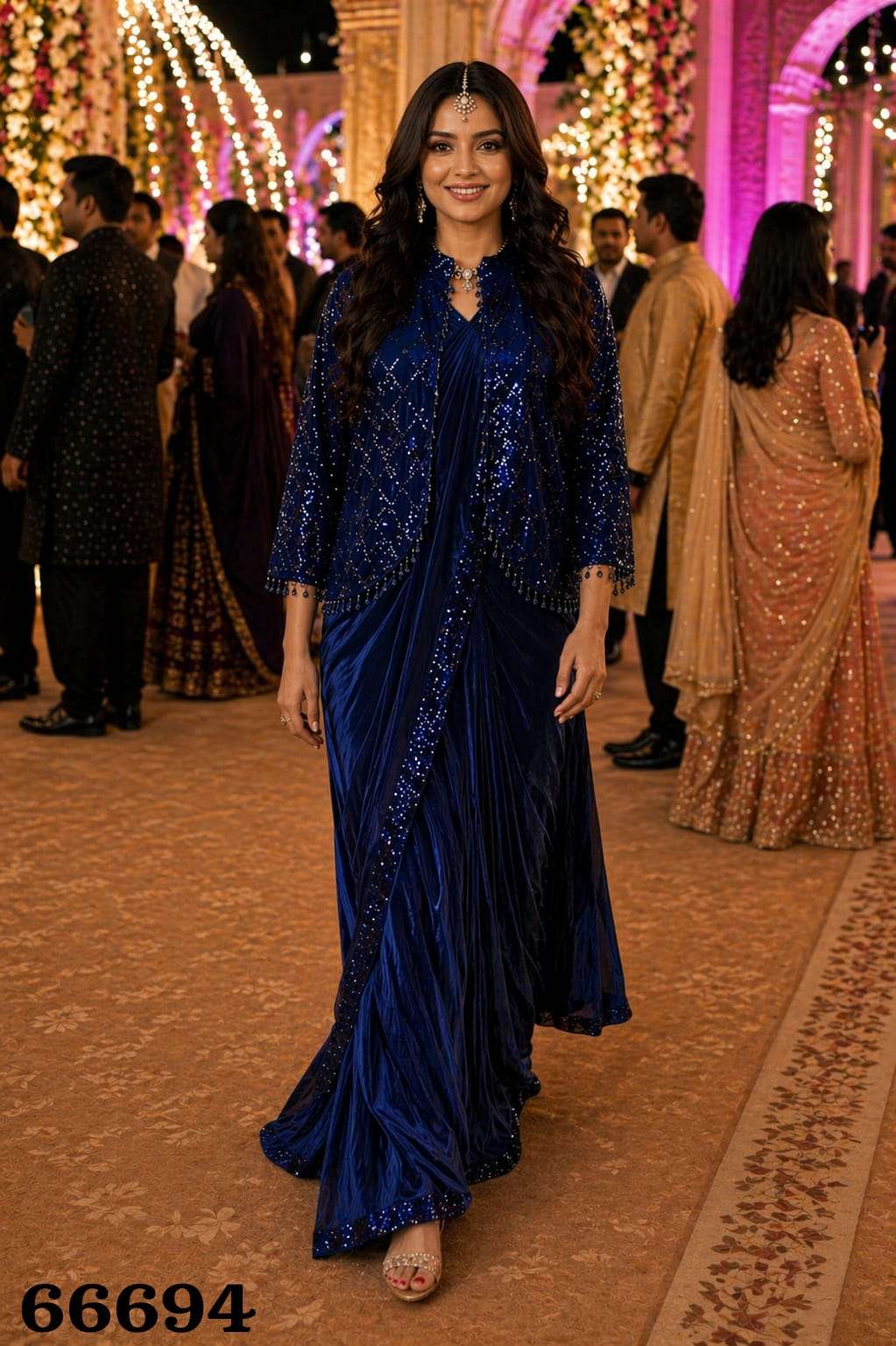 FABRIC - REAL PREMIUM LYCRA ( READY TO WEAR SAREE WITH FULL BLOUSE & JACKET WORK 38 SIZE FULL STICH WITH 4 INCH MARJIN )