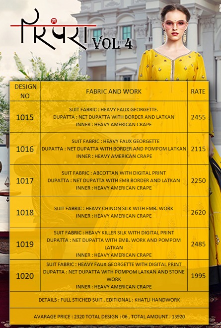 Buy Online Parampara Vol 4 Series 1015 Designer Party Wear Suits Wholesale Supplier Gujarat 0 Pcs of Full Catalogue at Wholesale Price. Looking for Parampara Vol 4 Series 1015 Designer Party Wear Suits Wholesale Supplier Gujarat Full Catalouge at Best Price? Buy Now Parampara Vol 4 Series 1015 Designer Party Wear Suits Wholesale Supplier Gujarat at Wholesale Rate of Rs 0 with Total 0 Pcs from authroized dealer and supplier of Brand. Cost of Each piece is just only Rs 0 which is very low and affordable price to resale the product in your retail store ,This is Surat based Wholesale Supplier & Dealer of Brand. Click on Brand name to Know more about Brand's products.Call or Whatsapp on 9898838984 for booking or enquiry