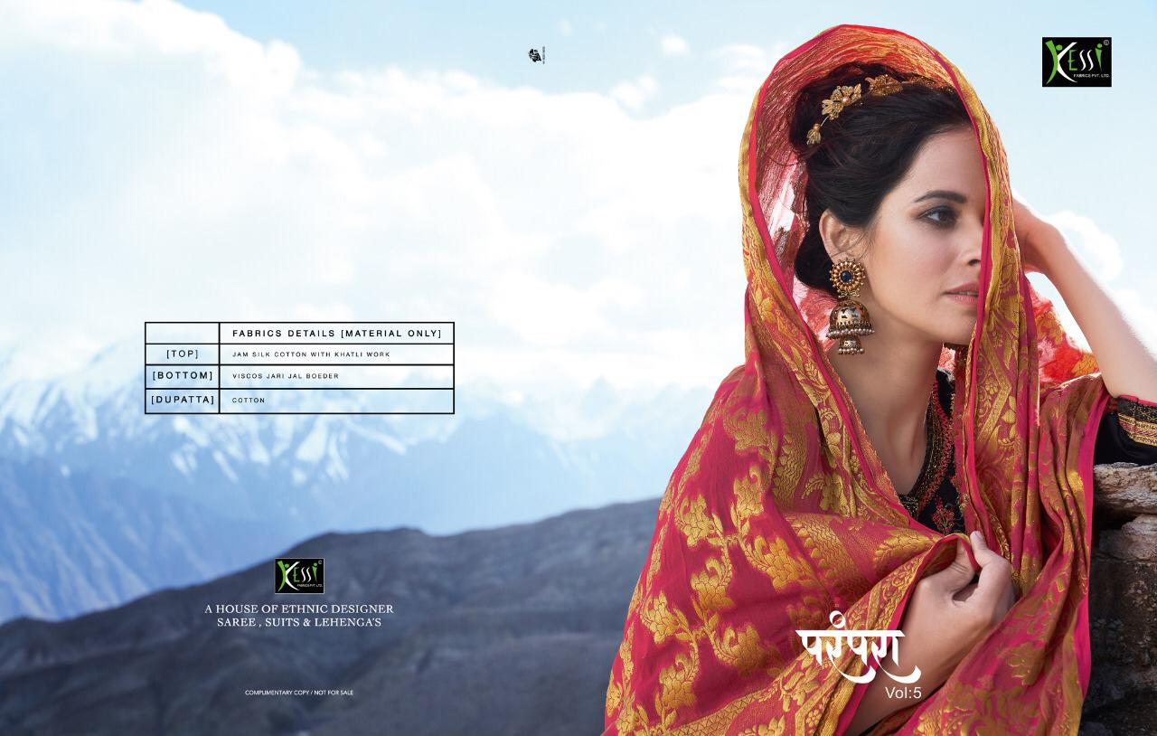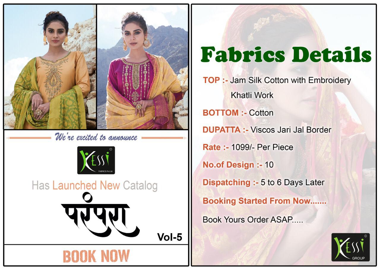 ? *Kessi Fabrics Pvt. Ltd.* has launched _Catalog name_ : *Parampara Vol - 5* ? _Fabric Details_ ? ?Top :- JAM SILK COTTON WITH EMBROIDERY KHATLI WORK ?Bottom:- COTTON ?Dupatta:- VISCOSE JARI JAL BORDER ?Total Design :- 10 Set To Set . ?Dispatching 5 to 6 days later ?Booking started from now... ?Order yours soon.... Rs - 1099/= GST 5 Percent Extra |
