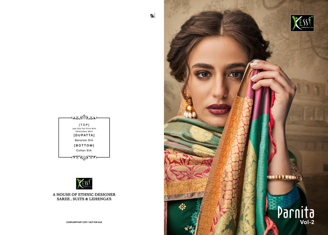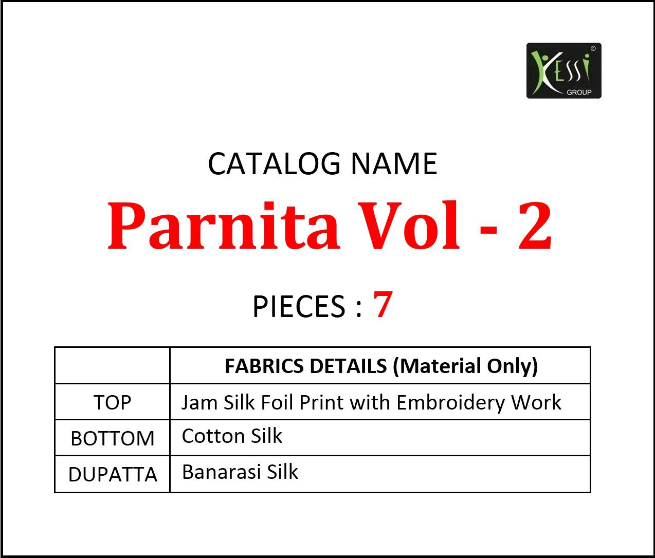 Buy Online Parnita Vol 2 By Kessi Jam Silk Dress Materials Wholesale Supplier Surat 7 Pcs of Full Catalogue at Wholesale Price. Looking for Parnita Vol 2 By Kessi Jam Silk Dress Materials Wholesale Supplier Surat Full Catalouge at Best Price? Buy Now Parnita Vol 2 By Kessi Jam Silk Dress Materials Wholesale Supplier Surat at Wholesale Rate of Rs 6293 with Total 7 Pcs from authroized dealer and supplier of KESSI Brand. Cost of Each piece is just only Rs 899 which is very low and affordable price to resale the product in your retail store ,This is Surat based Wholesale Supplier & Dealer of KESSI Brand. Click on Brand name to Know more about KESSI Brand's products.Call or Whatsapp on 9898838984 for booking or enquiry
