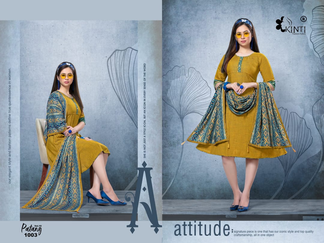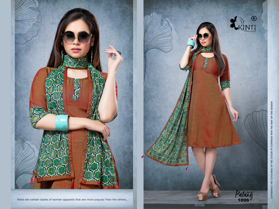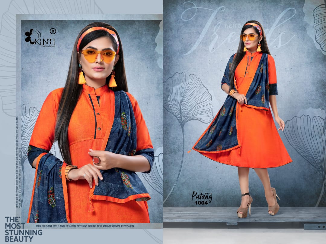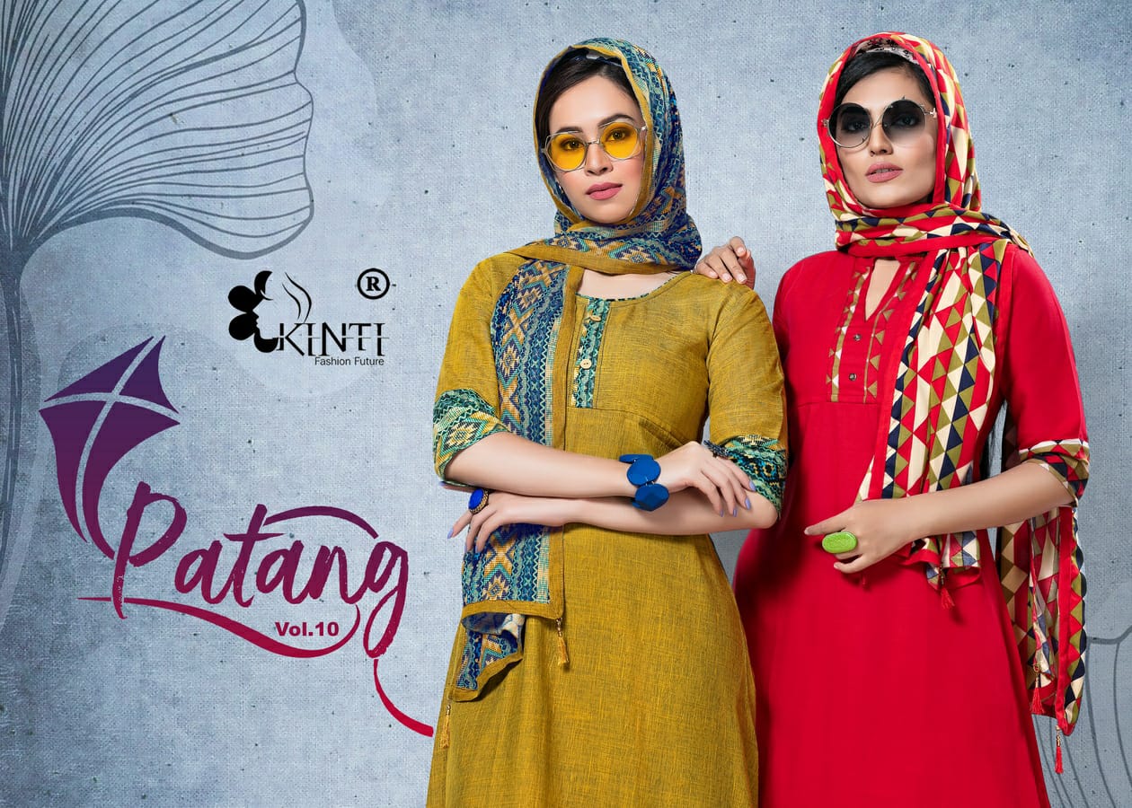 *PATANG 10* By *KINTI* ® *(Kurti With Stroll)* *Kurti* Fabric. : *Reyon two tone Slub* Length : *45* Approx Flair. : *40* Approx Sleeves : *3/4th sleeves* *Stroll* Fabric : *Reyon Print* Lenght : *2 mtr+* Sizes : _*S M* *L* *XL* *XXL 3xl 4xl 5xl*_ Designs : *10* *_Rate :- 405 + GST_* |