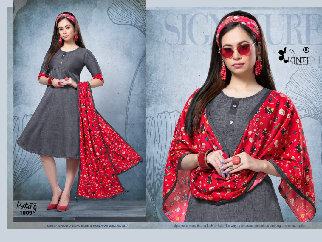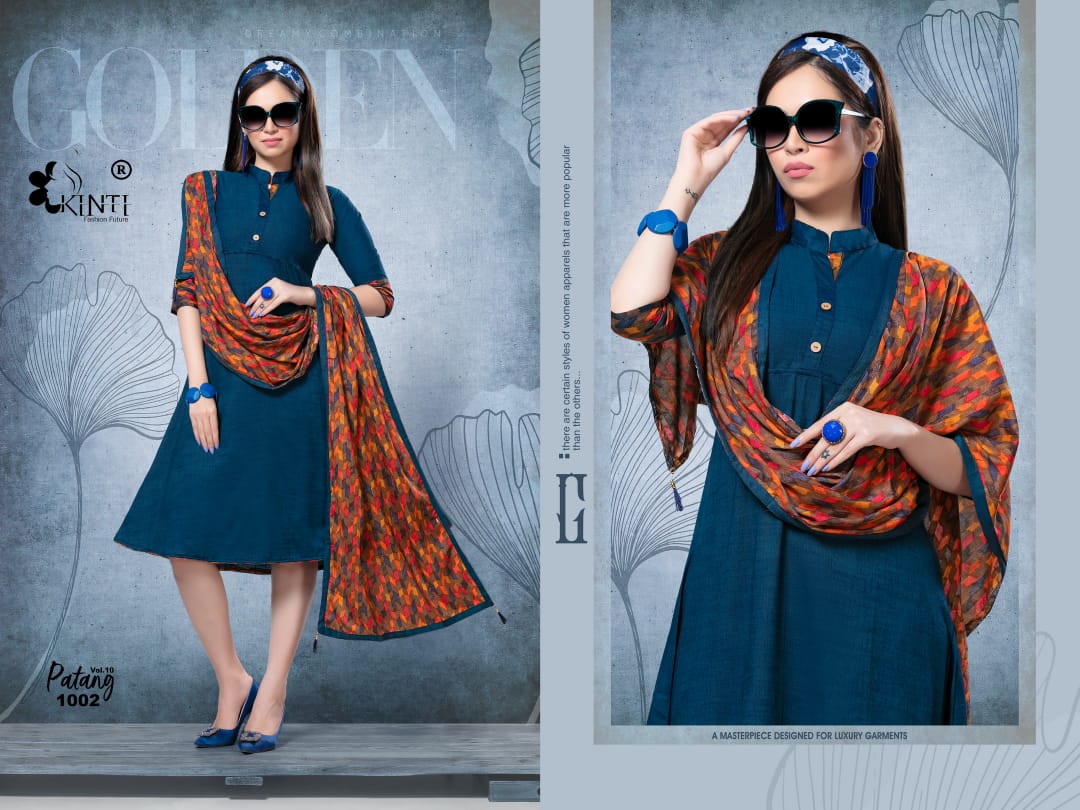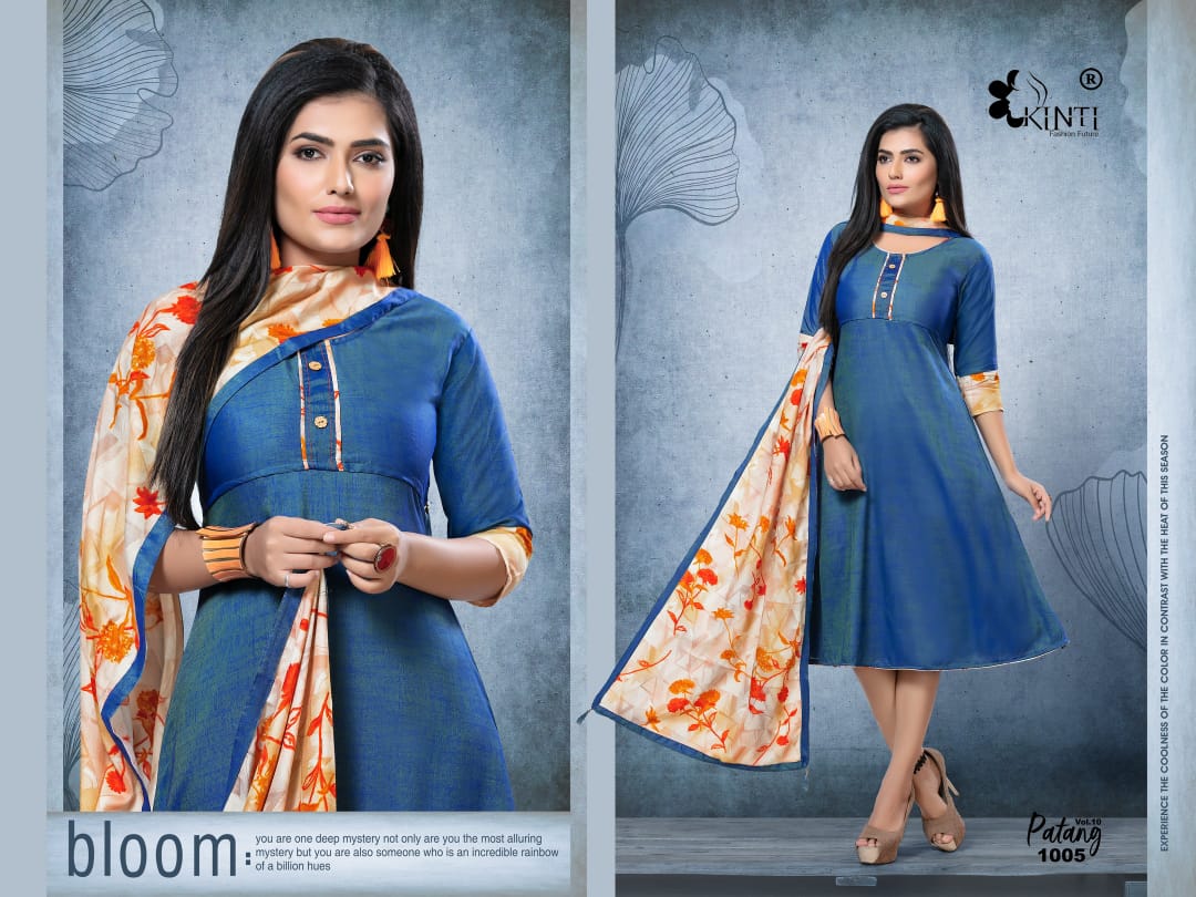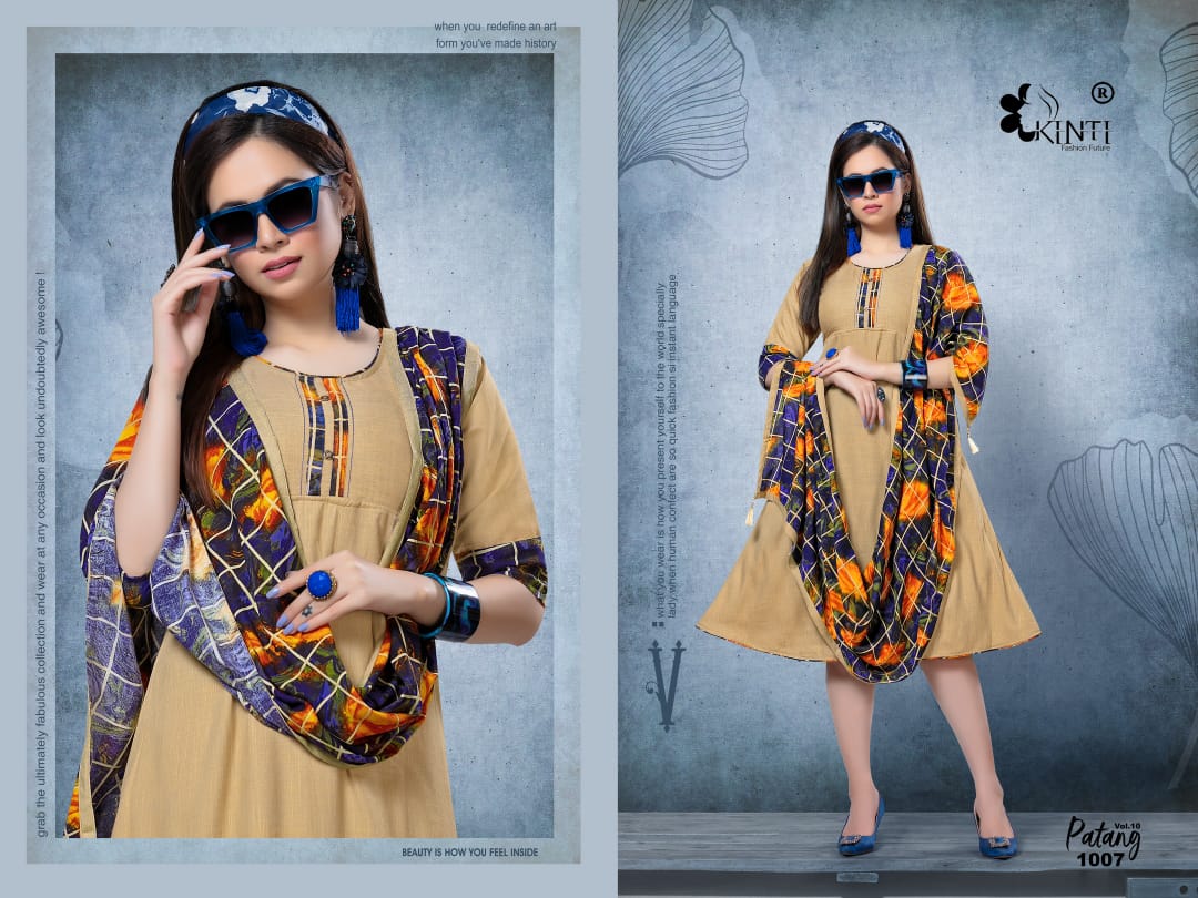 *PATANG 10* By *KINTI* ® *(Kurti With Stroll)* *Kurti* Fabric. : *Reyon two tone Slub* Length : *45* Approx Flair. : *40* Approx Sleeves : *3/4th sleeves* *Stroll* Fabric : *Reyon Print* Lenght : *2 mtr+* Sizes : _*S M* *L* *XL* *XXL 3xl 4xl 5xl*_ Designs : *10* *_Rate :- 405 + GST_* |