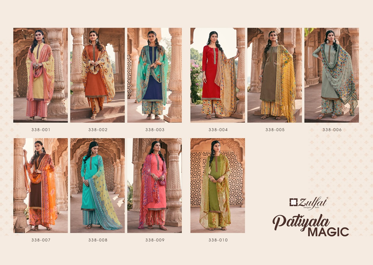 Buy Online Patiala Magic By Zulfat Designer Suits Wholesale Suppliers And Dealer From India 10 Pcs of Full Catalogue at Wholesale Price. Looking for Patiala Magic By Zulfat Designer Suits Wholesale Suppliers And Dealer From India Full Catalouge at Best Price? Buy Now Patiala Magic By Zulfat Designer Suits Wholesale Suppliers And Dealer From India at Wholesale Rate of Rs 4350 with Total 10 Pcs from authroized dealer and supplier of Brand. Cost of Each piece is just only Rs 435 which is very low and affordable price to resale the product in your retail store ,This is Surat based Wholesale Supplier & Dealer of Brand. Click on Brand name to Know more about Brand's products.Call or Whatsapp on 9898838984 for booking or enquiry