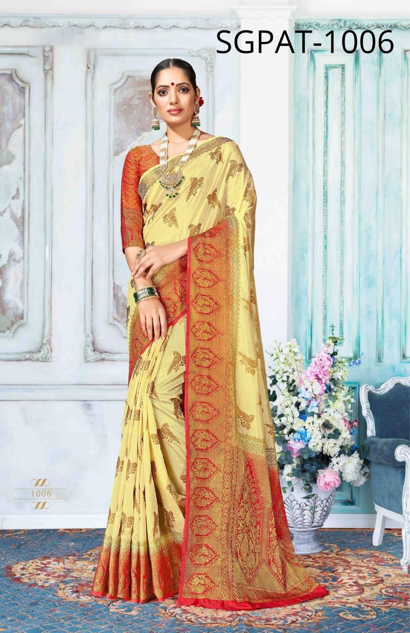 Buy Online Patto Jari Silk By Sangam Silk Sarees Set And Single Wholesale Supplier And Dealer Gujarat 6 Pcs of Full Catalogue at Wholesale Price. Looking for Patto Jari Silk By Sangam Silk Sarees Set And Single Wholesale Supplier And Dealer Gujarat Full Catalouge at Best Price? Buy Now Patto Jari Silk By Sangam Silk Sarees Set And Single Wholesale Supplier And Dealer Gujarat at Wholesale Rate of Rs 6240 with Total 6 Pcs from authroized dealer and supplier of BRAND'S Brand. Cost of Each piece is just only Rs 1040 which is very low and affordable price to resale the product in your retail store ,This is Surat based Wholesale Supplier & Dealer of BRAND'S Brand. Click on Brand name to Know more about BRAND'S Brand's products.Call or Whatsapp on 9898838984 for booking or enquiry