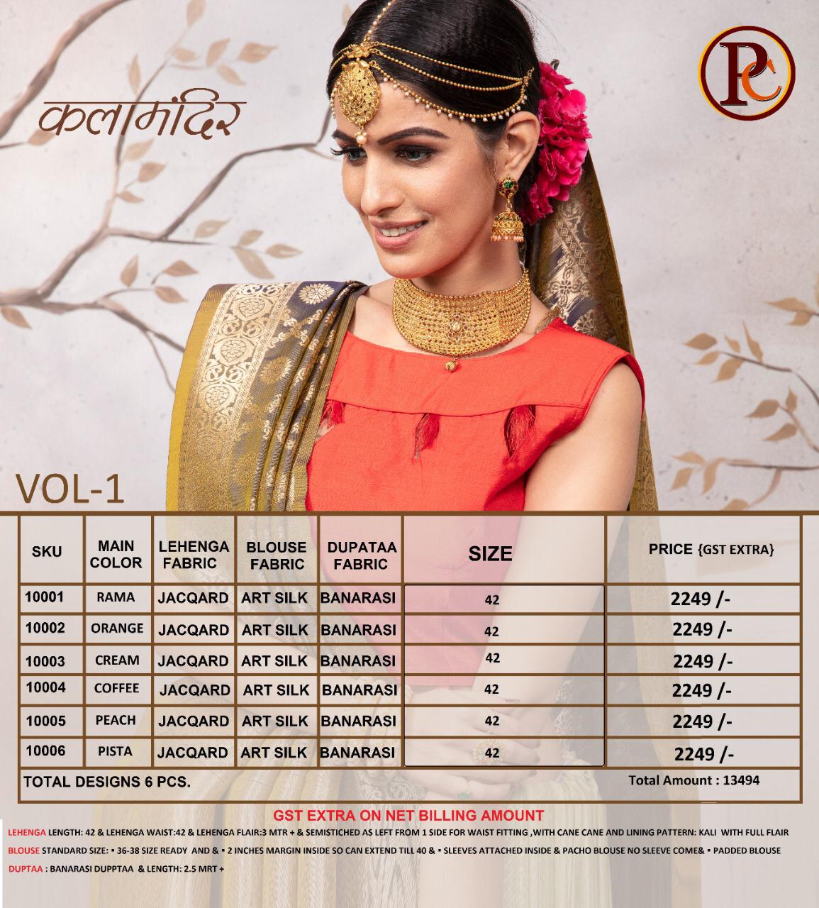 Buy Online Payal Creation Kalamandir Vol 1 Jaquard Lehngas Set And Single Wholesale Supplier Surat 6 Pcs of Full Catalogue at Wholesale Price. Looking for Payal Creation Kalamandir Vol 1 Jaquard Lehngas Set And Single Wholesale Supplier Surat Full Catalouge at Best Price? Buy Now Payal Creation Kalamandir Vol 1 Jaquard Lehngas Set And Single Wholesale Supplier Surat at Wholesale Rate of Rs 13494 with Total 6 Pcs from authroized dealer and supplier of Brand. Cost of Each piece is just only Rs 2249 which is very low and affordable price to resale the product in your retail store ,This is Surat based Wholesale Supplier & Dealer of Brand. Click on Brand name to Know more about Brand's products.Call or Whatsapp on 9898838984 for booking or enquiry
