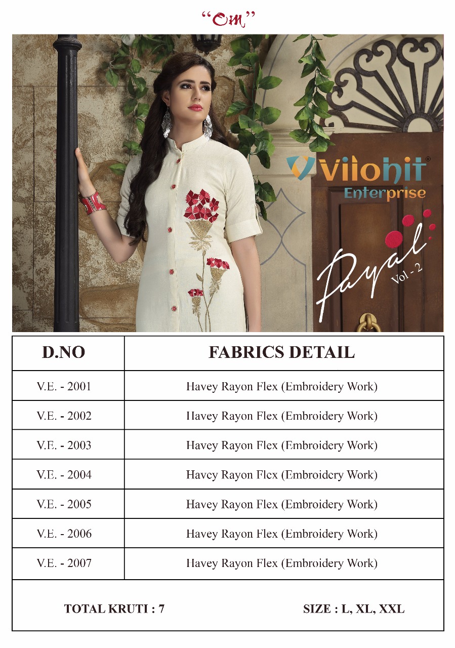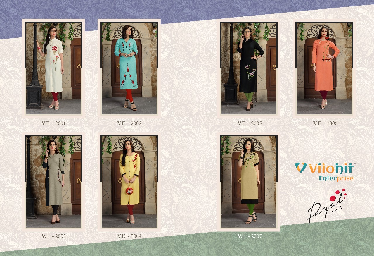 Buy Online Payal Vol 2 By Vilohit New Colors Of Straight Style Kurtis Wholesale Supplier And Dealer Gujarat 7 Pcs of Full Catalogue at Wholesale Price. Looking for Payal Vol 2 By Vilohit New Colors Of Straight Style Kurtis Wholesale Supplier And Dealer Gujarat Full Catalouge at Best Price? Buy Now Payal Vol 2 By Vilohit New Colors Of Straight Style Kurtis Wholesale Supplier And Dealer Gujarat at Wholesale Rate of Rs 4375 with Total 7 Pcs from authroized dealer and supplier of Vilohit enterprise Brand. Cost of Each piece is just only Rs 625 which is very low and affordable price to resale the product in your retail store ,This is Surat based Wholesale Supplier & Dealer of Vilohit enterprise Brand. Click on Brand name to Know more about Vilohit enterprise Brand's products.Call or Whatsapp on 9898838984 for booking or enquiry