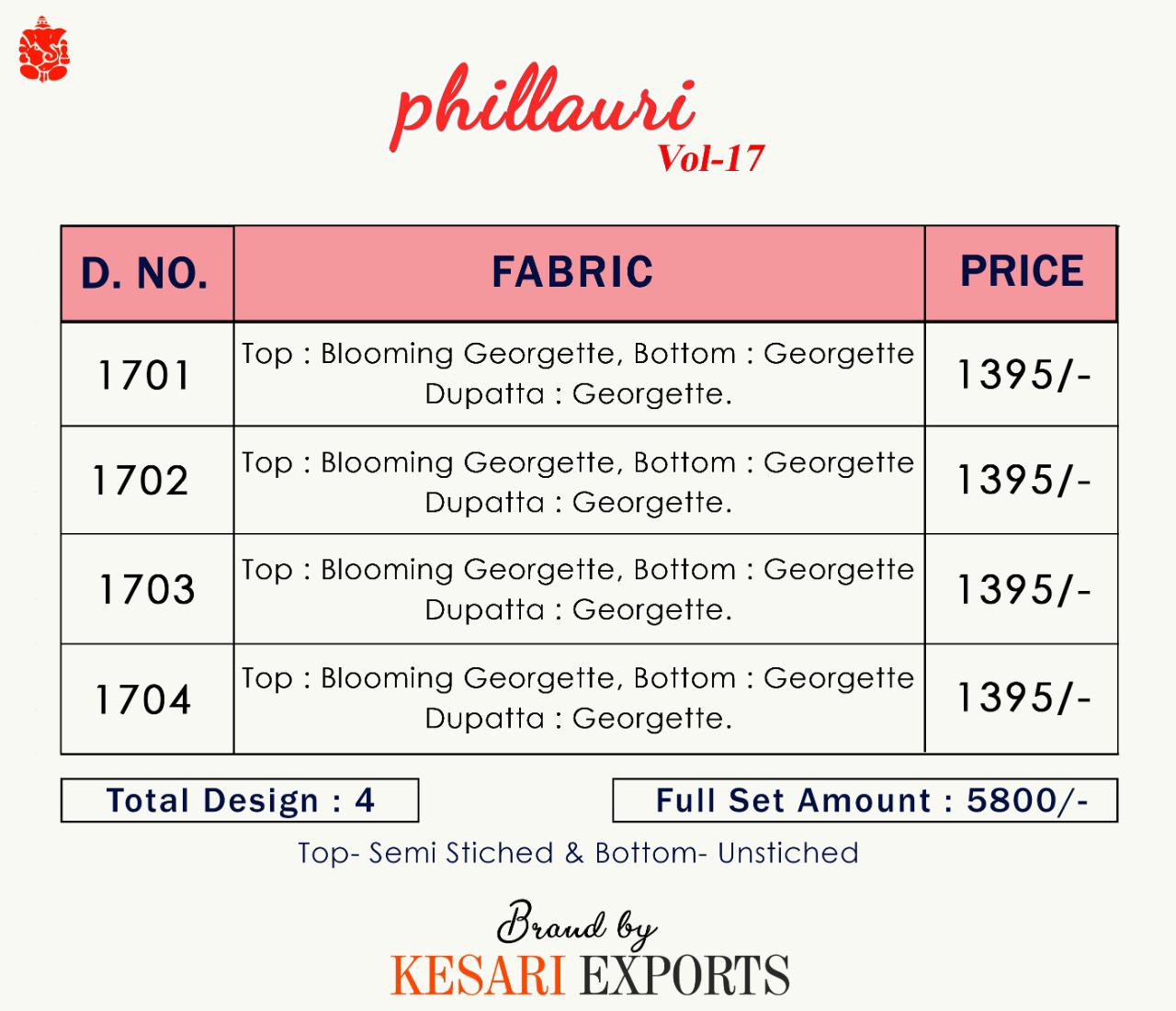 Buy Online Phillauri Vol 17 By Kesari Export Designer Party Wear Suits Wholesale Supplier Gujarat 4 Pcs of Full Catalogue at Wholesale Price. Looking for Phillauri Vol 17 By Kesari Export Designer Party Wear Suits Wholesale Supplier Gujarat Full Catalouge at Best Price? Buy Now Phillauri Vol 17 By Kesari Export Designer Party Wear Suits Wholesale Supplier Gujarat at Wholesale Rate of Rs 5580 with Total 4 Pcs from authroized dealer and supplier of Brand. Cost of Each piece is just only Rs 1395 which is very low and affordable price to resale the product in your retail store ,This is Surat based Wholesale Supplier & Dealer of Brand. Click on Brand name to Know more about Brand's products.Call or Whatsapp on 9898838984 for booking or enquiry