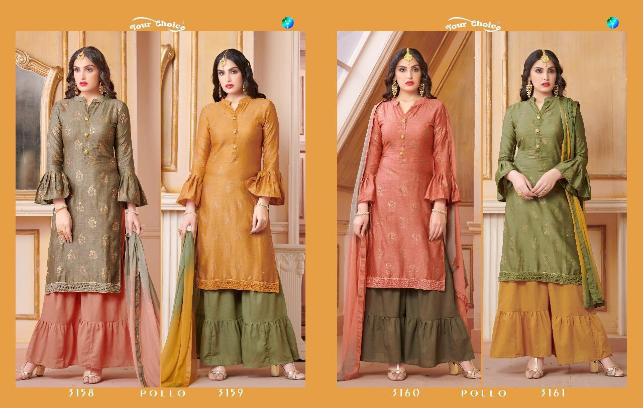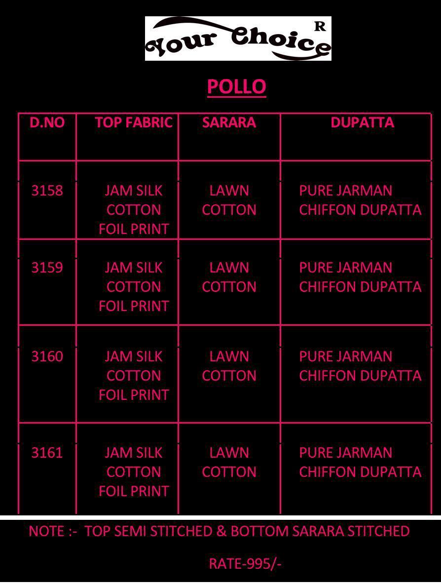 Buy Online Pollo By Your Choice Jam Silk Cotton Foil Printed Suits Wholesale Supplier Gujarat 4 Pcs of Full Catalogue at Wholesale Price. Looking for Pollo By Your Choice Jam Silk Cotton Foil Printed Suits Wholesale Supplier Gujarat Full Catalouge at Best Price? Buy Now Pollo By Your Choice Jam Silk Cotton Foil Printed Suits Wholesale Supplier Gujarat at Wholesale Rate of Rs 3980 with Total 4 Pcs from authroized dealer and supplier of YOUR CHOICE Brand. Cost of Each piece is just only Rs 995 which is very low and affordable price to resale the product in your retail store ,This is Surat based Wholesale Supplier & Dealer of YOUR CHOICE Brand. Click on Brand name to Know more about YOUR CHOICE Brand's products.Call or Whatsapp on 9898838984 for booking or enquiry