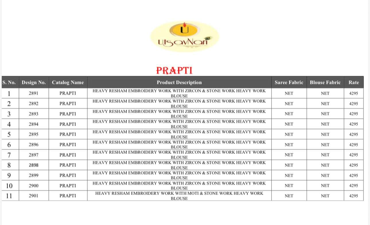 Buy Online PRAPTI by utasav nari fashion saree Collection manufacturer surat 11 Pcs of Full Catalogue at Wholesale Price. Looking for PRAPTI by utasav nari fashion saree Collection manufacturer surat Full Catalouge at Best Price? Buy Now PRAPTI by utasav nari fashion saree Collection manufacturer surat at Wholesale Rate of Rs 47245 with Total 11 Pcs from authroized dealer and supplier of BRAND'S Brand. Cost of Each piece is just only Rs 4295 which is very low and affordable price to resale the product in your retail store ,This is Surat based Wholesale Supplier & Dealer of BRAND'S Brand. Click on Brand name to Know more about BRAND'S Brand's products.Call or Whatsapp on 9898838984 for booking or enquiry