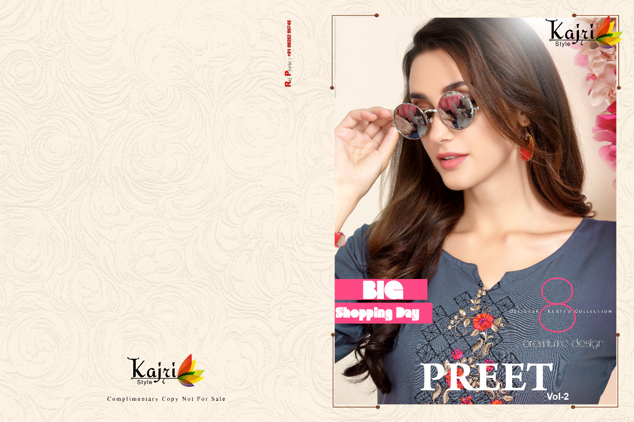 Buy Online Preet Vol 2 By Kajri Style Reyon Tops Wholesale Supplier Nd Dealer Gujarat 8 Pcs of Full Catalogue at Wholesale Price. Looking for Preet Vol 2 By Kajri Style Reyon Tops Wholesale Supplier Nd Dealer Gujarat Full Catalouge at Best Price? Buy Now Preet Vol 2 By Kajri Style Reyon Tops Wholesale Supplier Nd Dealer Gujarat at Wholesale Rate of Rs 3160 with Total 8 Pcs from authroized dealer and supplier of KAJRI STYLE Brand. Cost of Each piece is just only Rs 395 which is very low and affordable price to resale the product in your retail store ,This is Surat based Wholesale Supplier & Dealer of KAJRI STYLE Brand. Click on Brand name to Know more about KAJRI STYLE Brand's products.Call or Whatsapp on 9898838984 for booking or enquiry