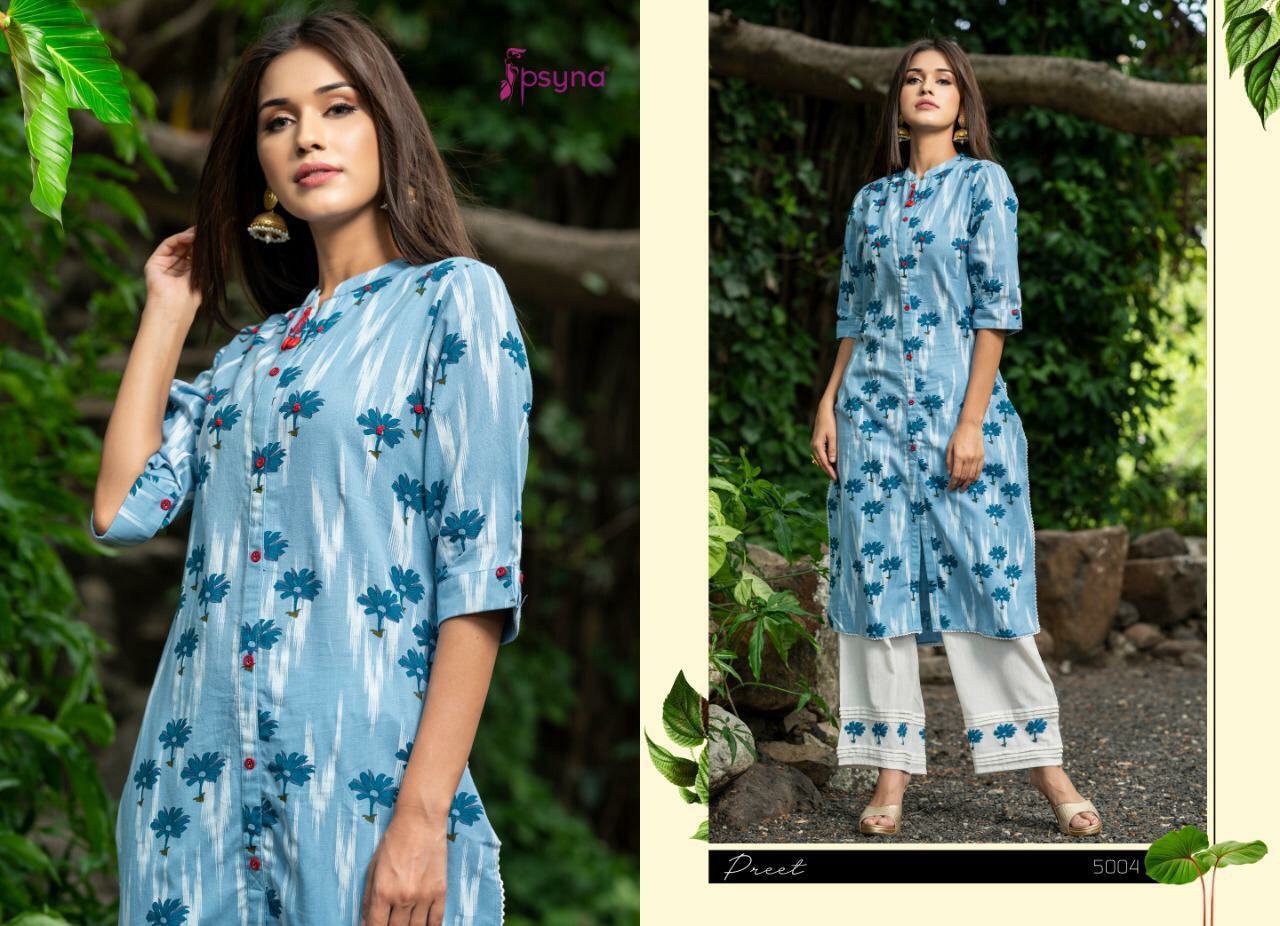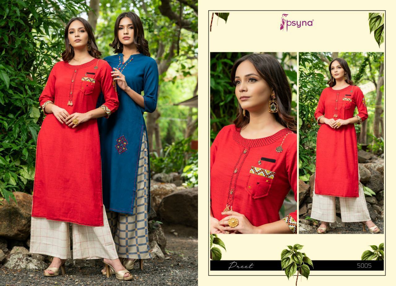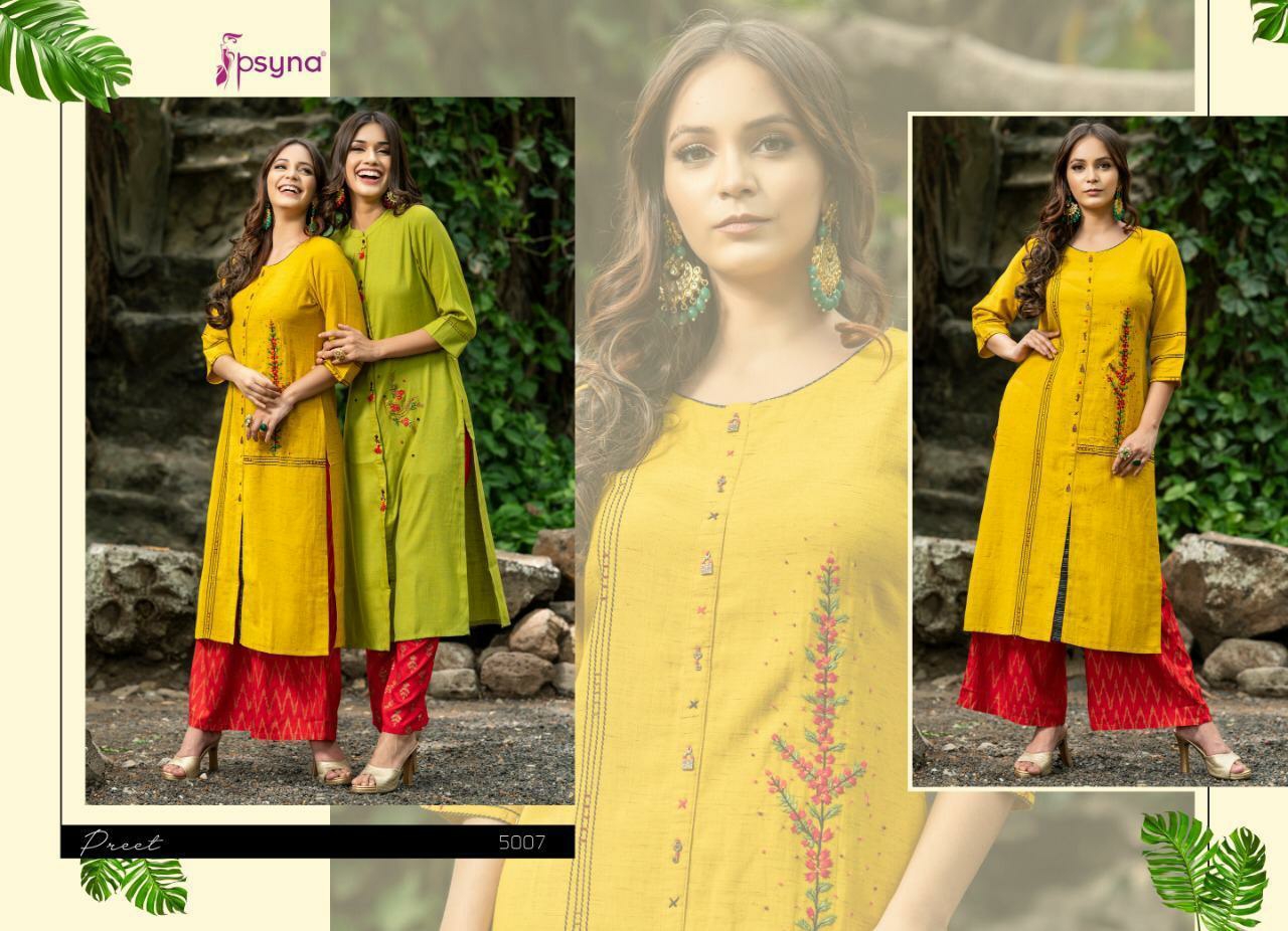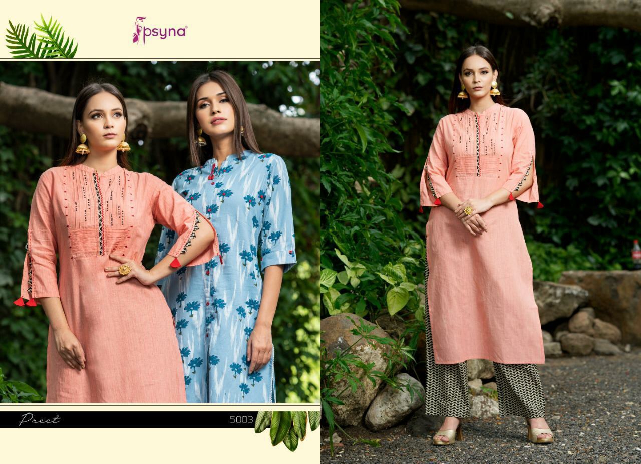 Buy Online Preet Vol 4 By Pysna Handloom Cotton Kurtis With Plazzo Wholesale Supplier Surat 8 Pcs of Full Catalogue at Wholesale Price. Looking for Preet Vol 4 By Pysna Handloom Cotton Kurtis With Plazzo Wholesale Supplier Surat Full Catalouge at Best Price? Buy Now Preet Vol 4 By Pysna Handloom Cotton Kurtis With Plazzo Wholesale Supplier Surat at Wholesale Rate of Rs 7800 with Total 8 Pcs from authroized dealer and supplier of PSYNA Brand. Cost of Each piece is just only Rs 975 which is very low and affordable price to resale the product in your retail store ,This is Surat based Wholesale Supplier & Dealer of PSYNA Brand. Click on Brand name to Know more about PSYNA Brand's products.Call or Whatsapp on 9898838984 for booking or enquiry