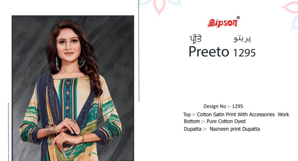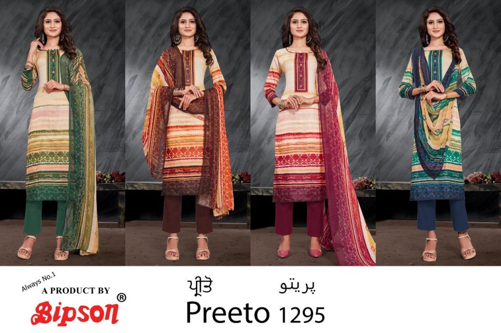 Buy Online Preeto 1295 By Bipson Cottan Suit 4 Pcs of Full Catalogue at Wholesale Price. Looking for Preeto 1295 By Bipson Cottan Suit Full Catalouge at Best Price? Buy Now Preeto 1295 By Bipson Cottan Suit at Wholesale Rate of Rs 2060 with Total 4 Pcs from authroized dealer and supplier of Bipson prints pvt ltd Brand. Cost of Each piece is just only Rs 515 which is very low and affordable price to resale the product in your retail store ,This is Surat based Wholesale Supplier & Dealer of Bipson prints pvt ltd Brand. Click on Brand name to Know more about Bipson prints pvt ltd Brand's products.Call or Whatsapp on 9898838984 for booking or enquiry