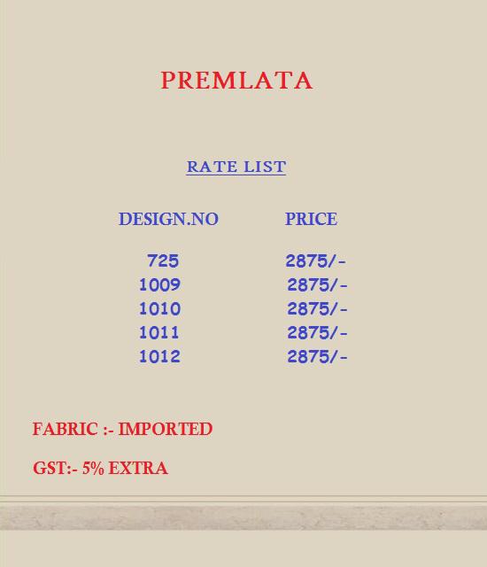 Brand - Premlata . Hit series . Set & Loose & Singel. No Catlog book . Singel - Singel Pcs . Available. * All Imported Fabric * GST 5 Percent Extra. Single extra ? Delivery from tomorrow |