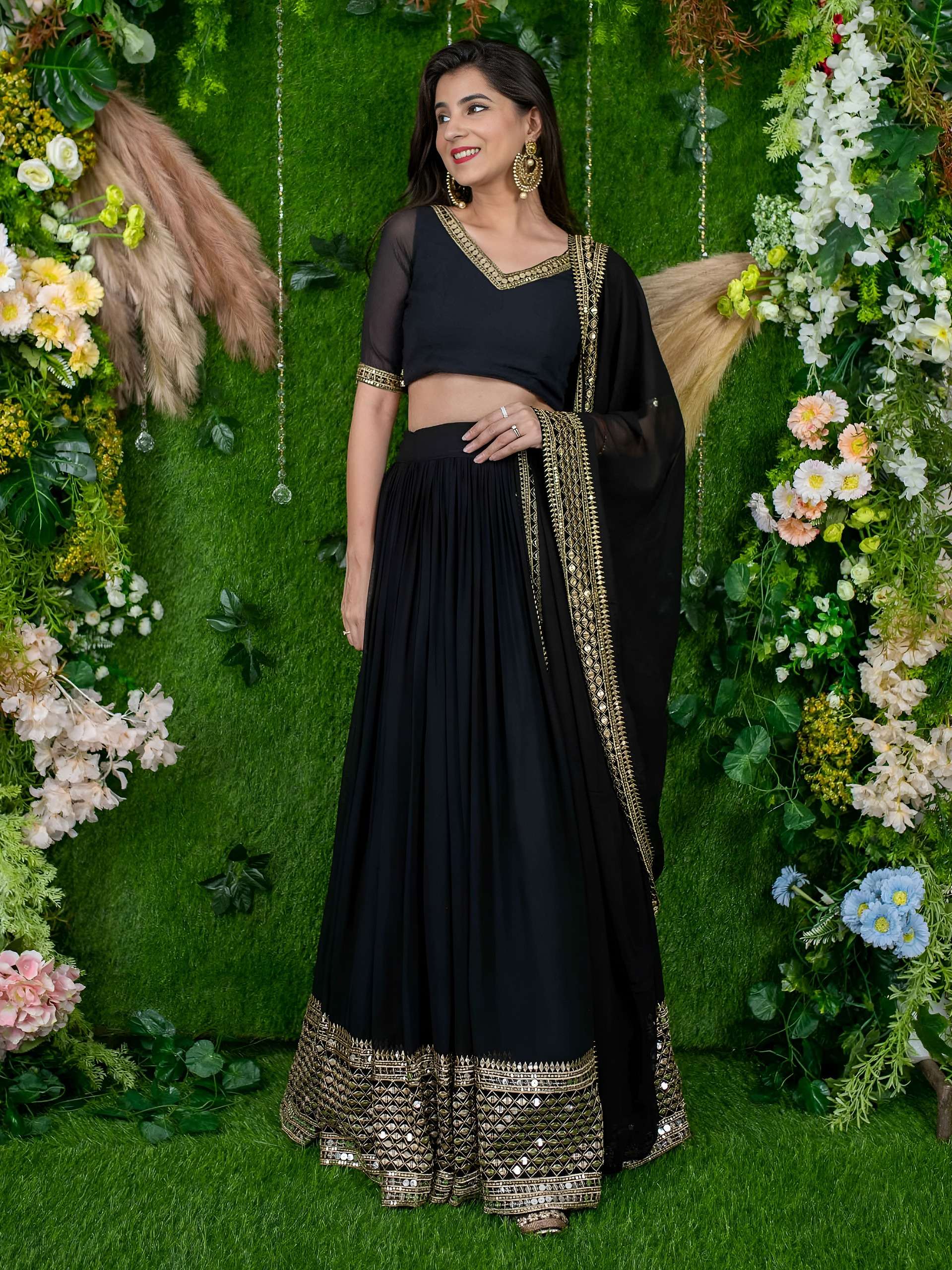 This black lehenga set exudes timeless elegance with its flowy silhouette and rich golden border detailing 🖤✨. Paired with a stylish blouse and matching dupatta, it’s perfect for festive and evening occasions.