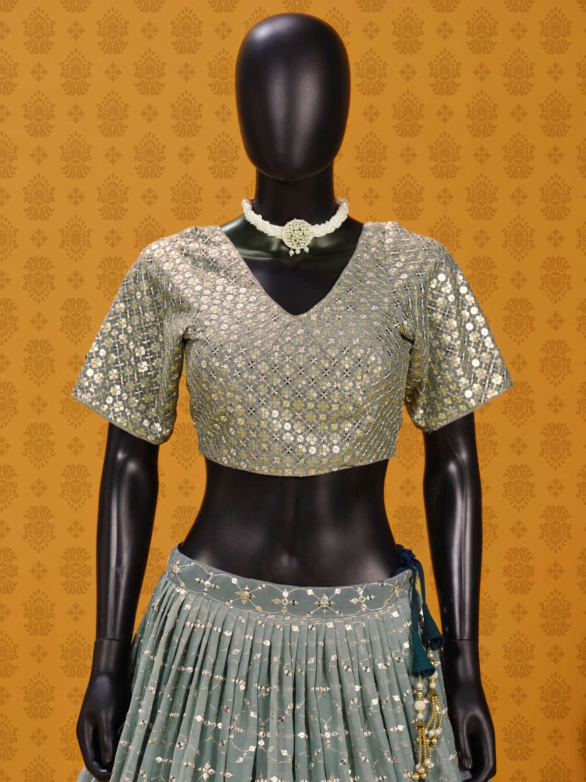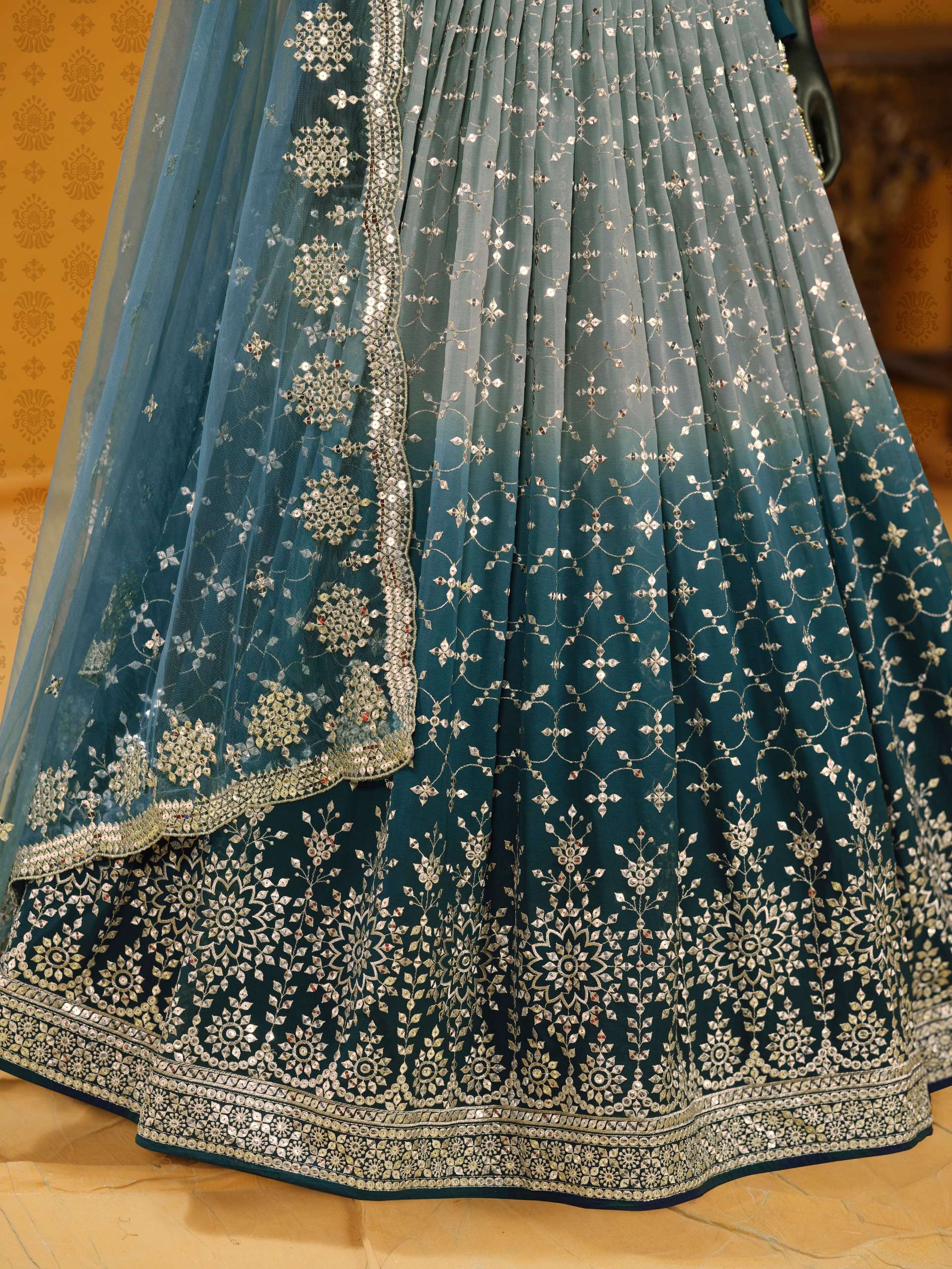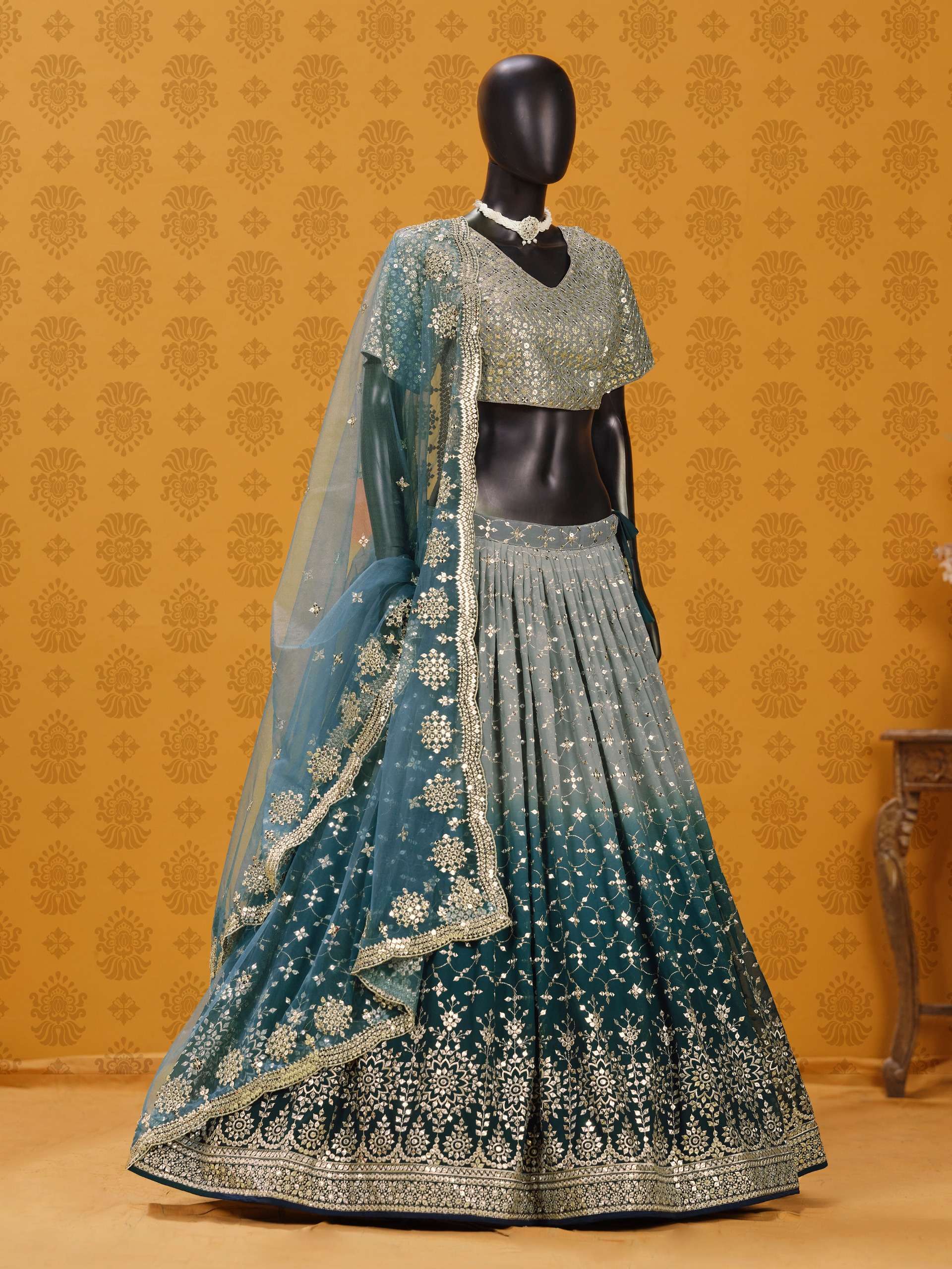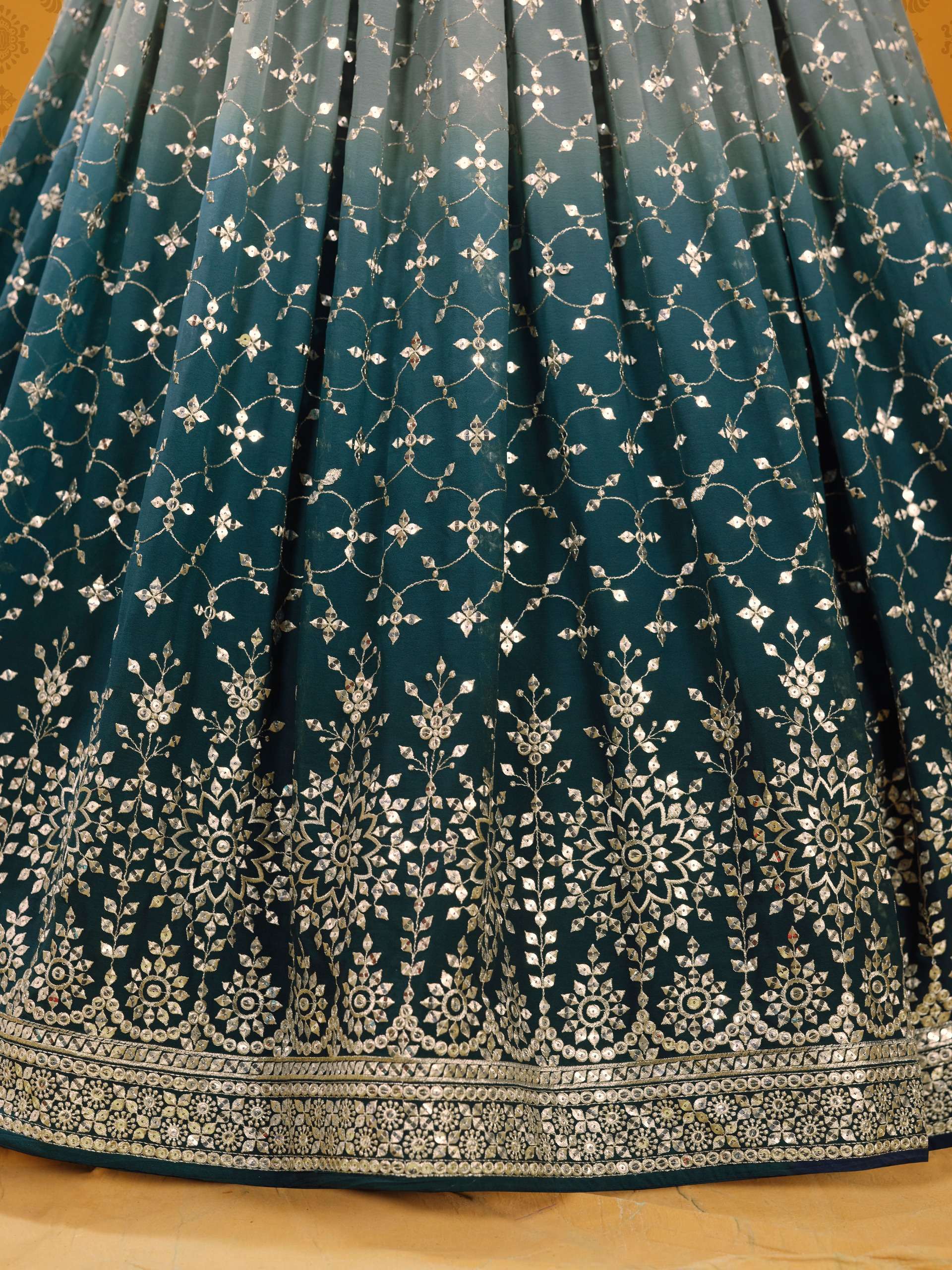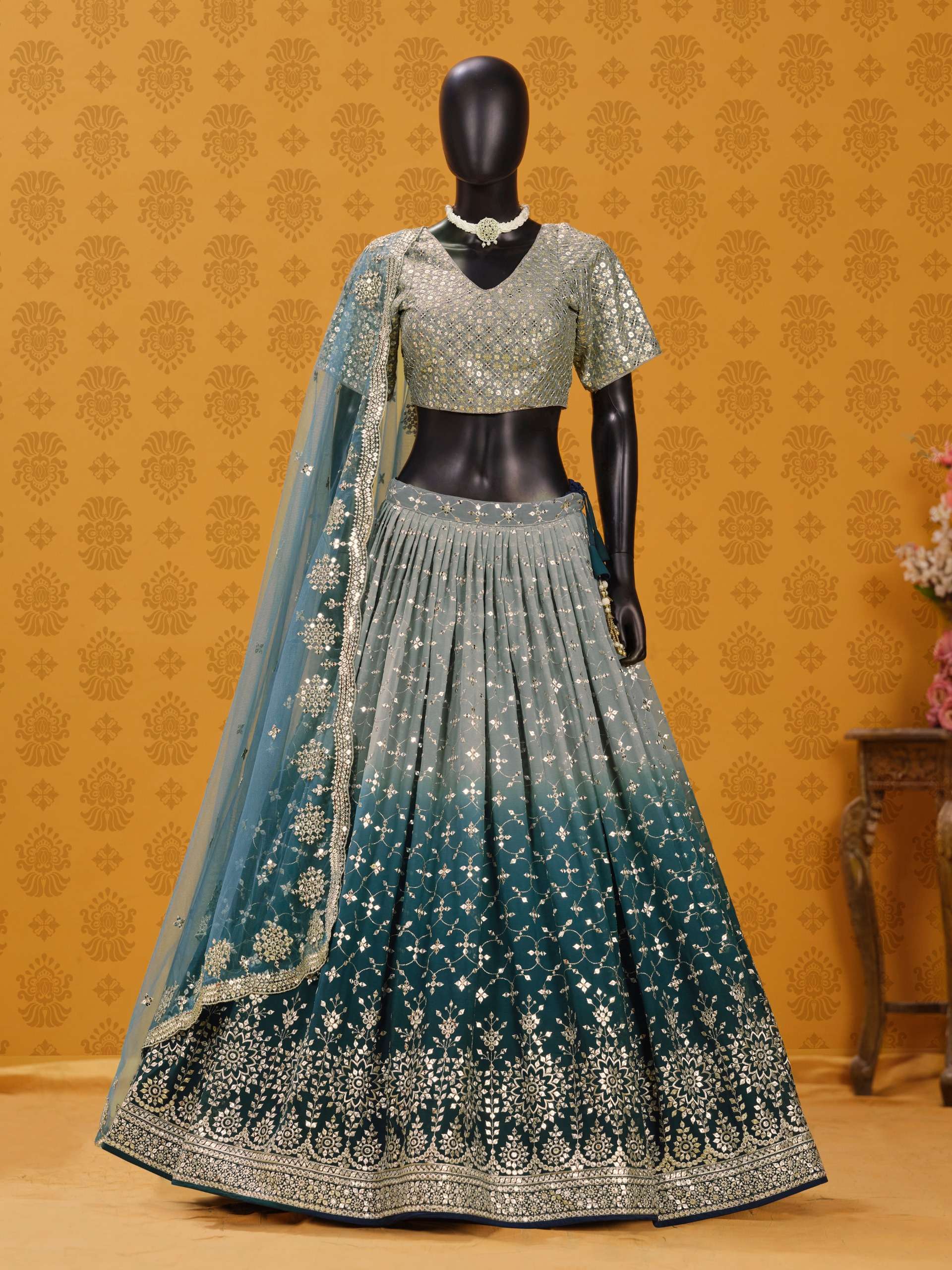 *Lehenga:* The Georgette Ombre lehenga features a beautiful gradient from grey to dove blue, adorned with heavy silver zari and sequins embroidery in elaborate floral and geometric patterns, creating a luxurious and traditional look.