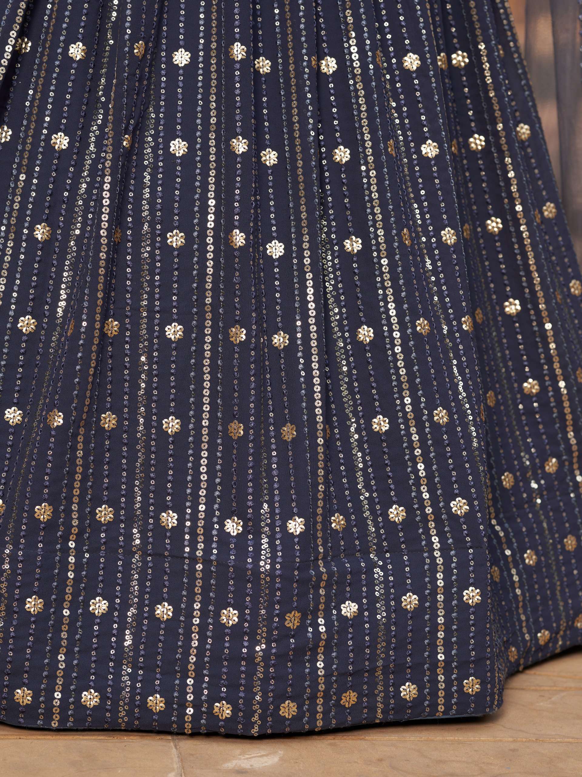 ✨ *Lehenga* : The deep midnight-grey georgette lehenga is adorned with delicate foil mirror and sequin butti work arranged in elegant vertical patterns, creating a refined festive shimmer ✨. Its flowy silhouette adds graceful movement, making it perfect for evening celebrations 💃.