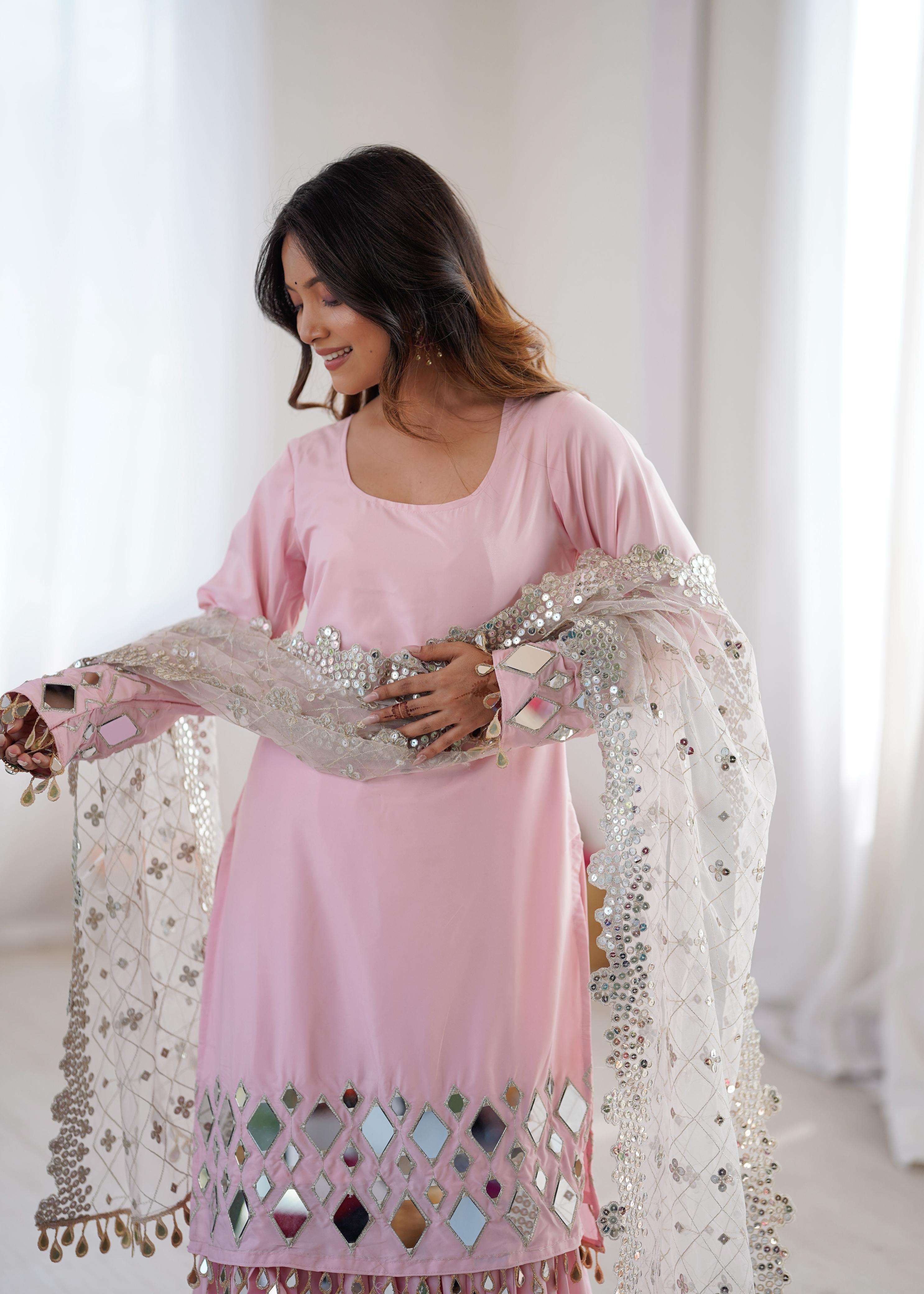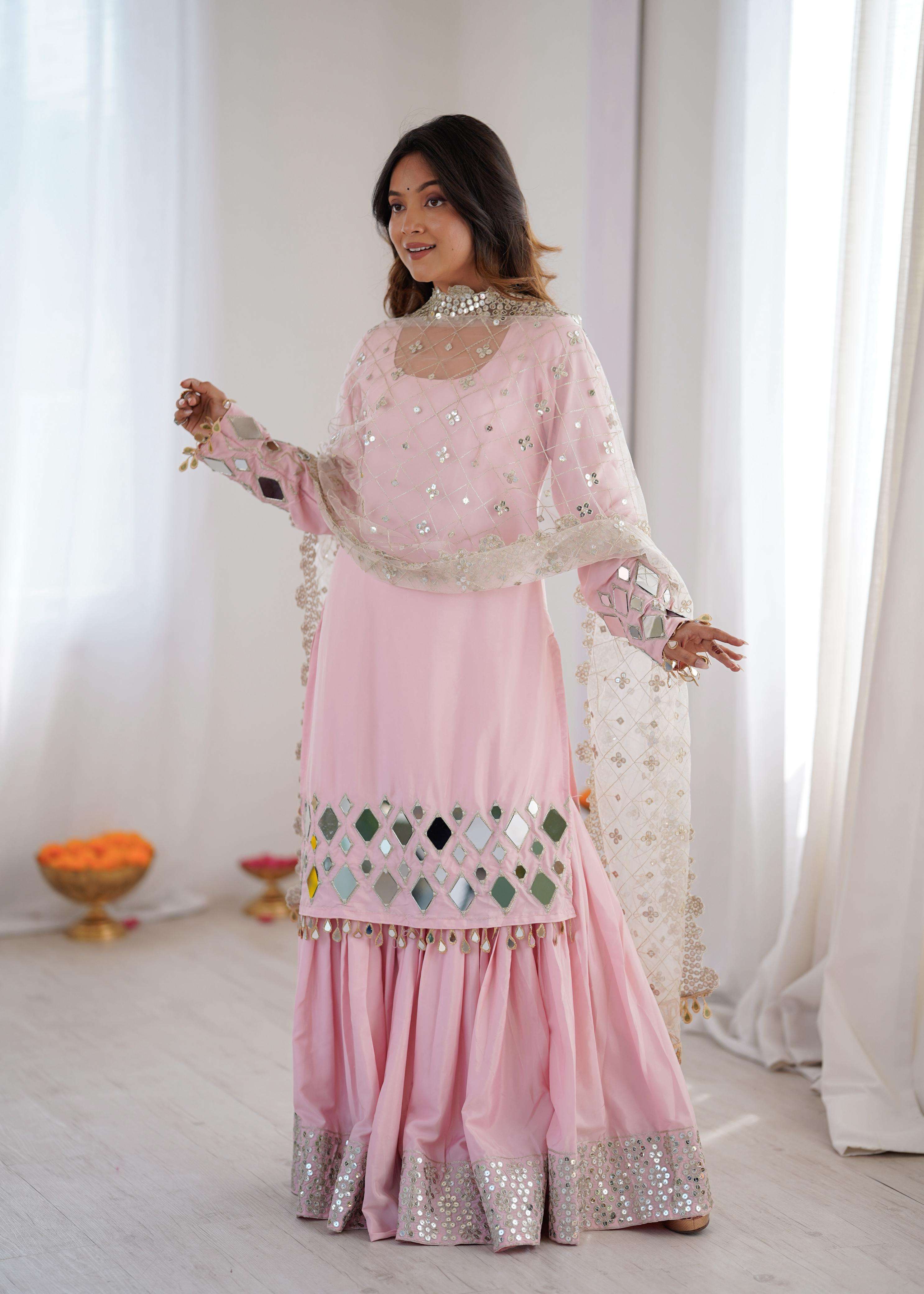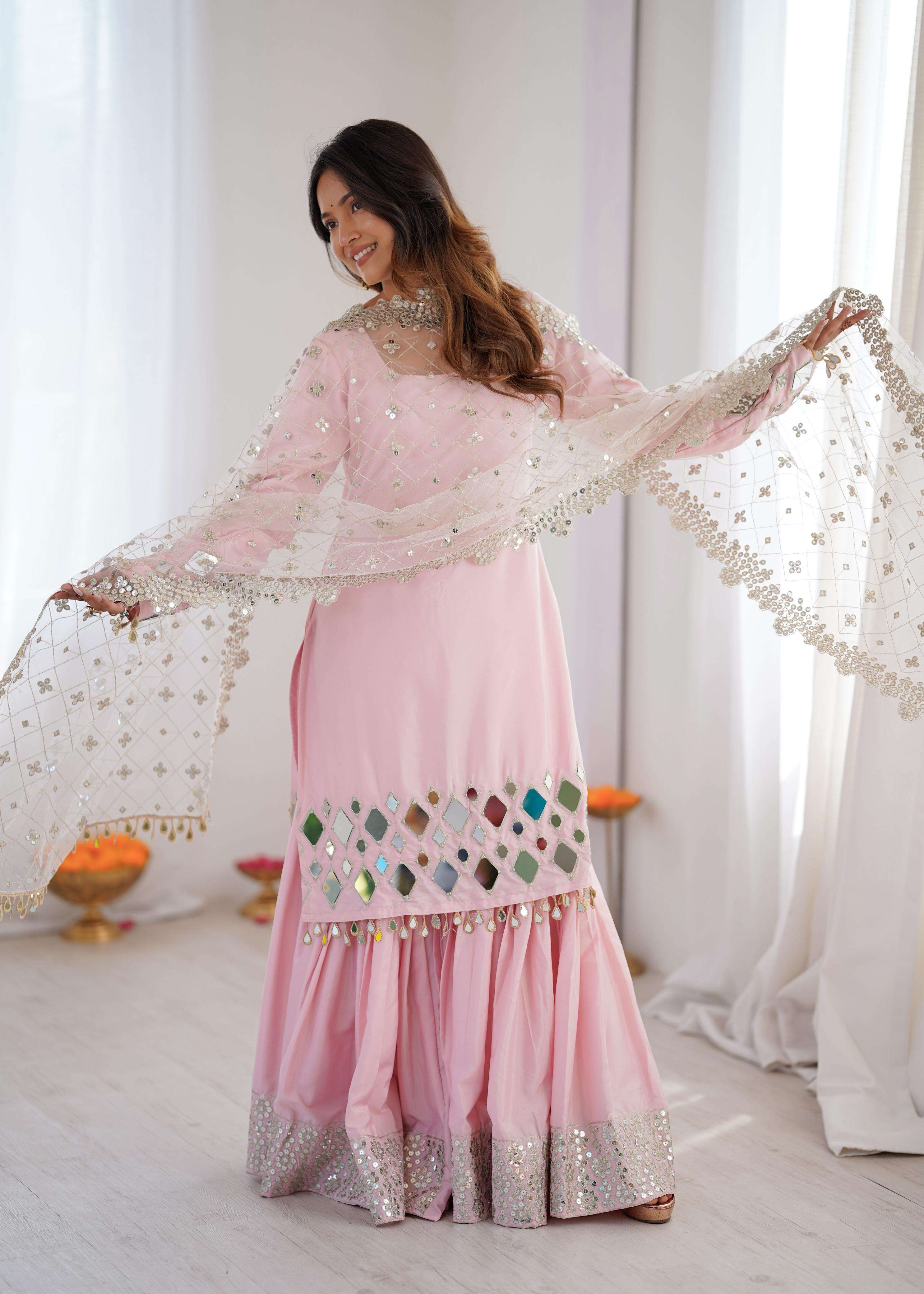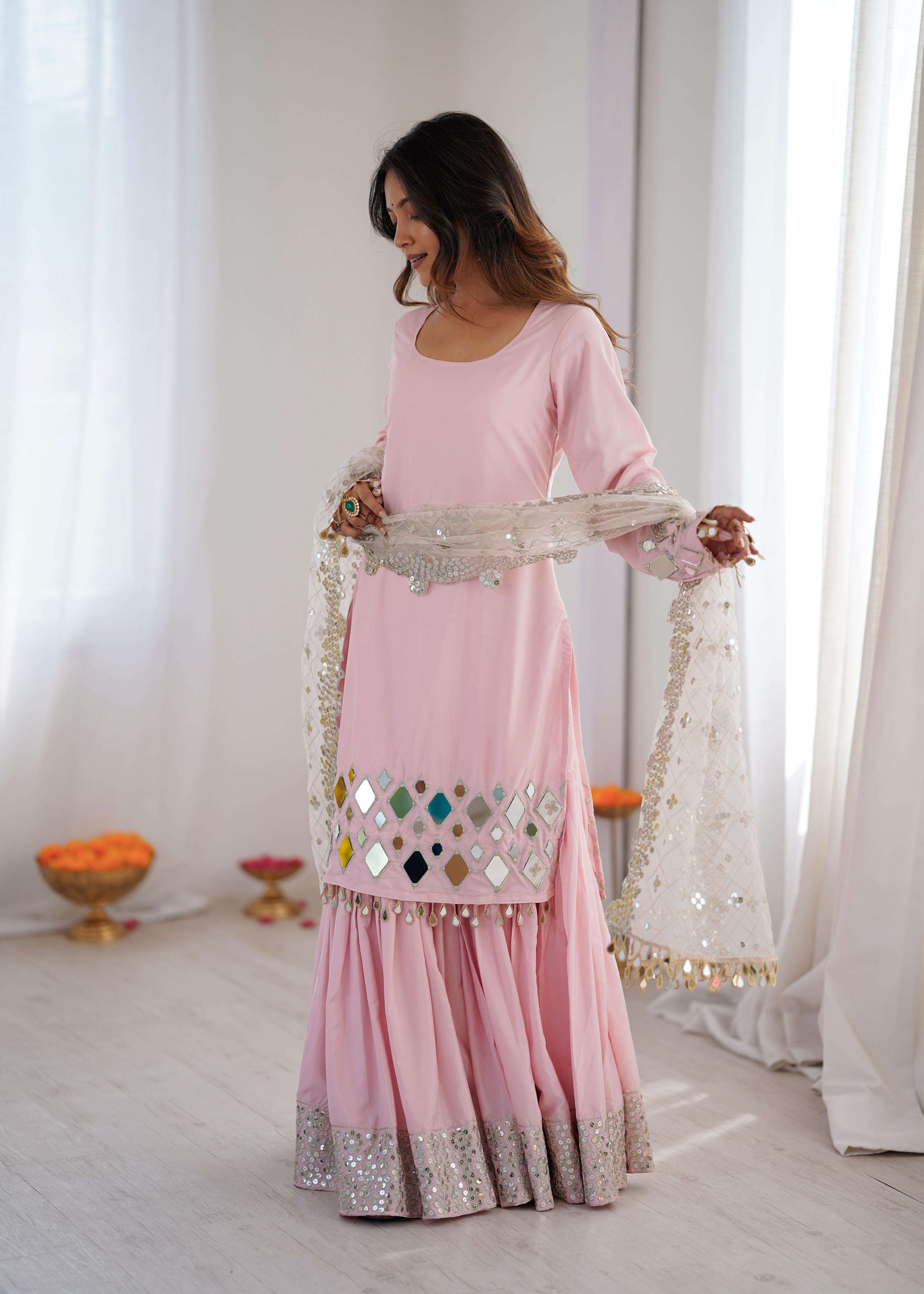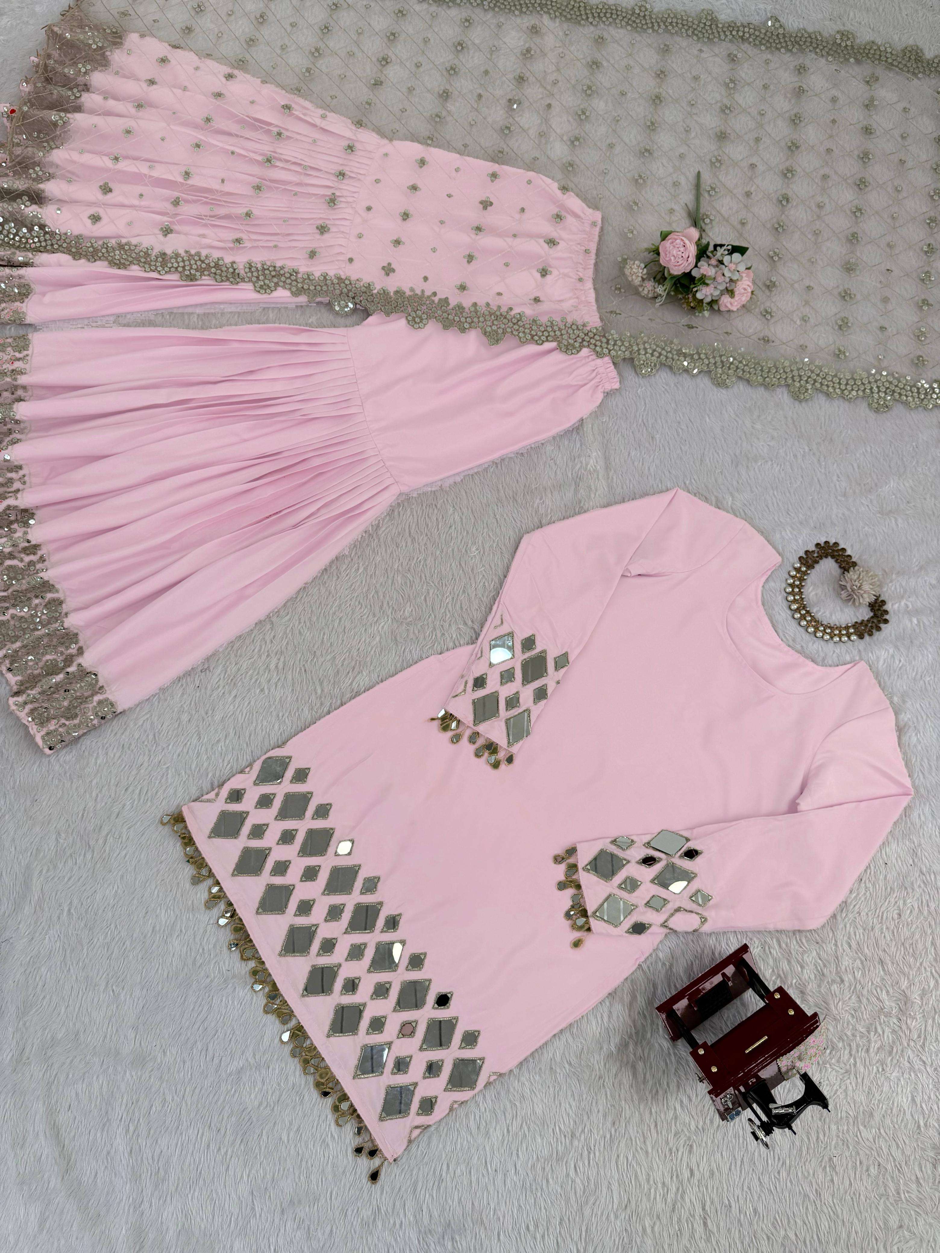 👖 *Sharara* • *Fabric*: Premium French crep • *Lining*: Comfortable Micro • *Work*: Embroidery Thread With 9MM Sequnce Detailing • *Fit*: Fully Stitched up to Size 44 | Elastic Waistband for Ease