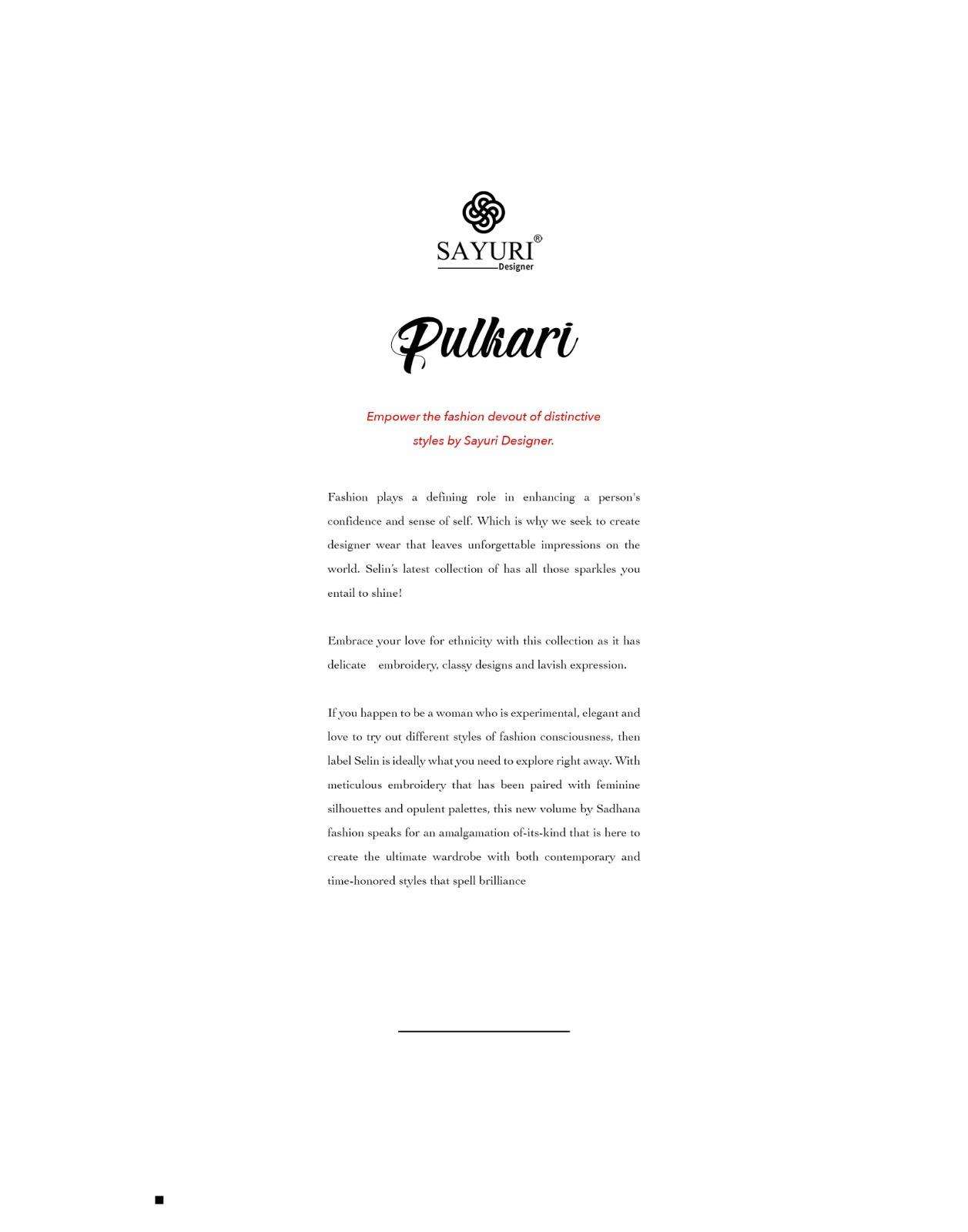 Buy Online PULKARI by SAYURI DESIGNER suit collection manufacturer Surat 2 Pcs of Full Catalogue at Wholesale Price. Looking for PULKARI by SAYURI DESIGNER suit collection manufacturer Surat Full Catalouge at Best Price? Buy Now PULKARI by SAYURI DESIGNER suit collection manufacturer Surat at Wholesale Rate of Rs 4798 with Total 2 Pcs from authroized dealer and supplier of SAYURI DESIGNER Brand. Cost of Each piece is just only Rs 2399 which is very low and affordable price to resale the product in your retail store ,This is Surat based Wholesale Supplier & Dealer of SAYURI DESIGNER Brand. Click on Brand name to Know more about SAYURI DESIGNER Brand's products.Call or Whatsapp on 9898838984 for booking or enquiry