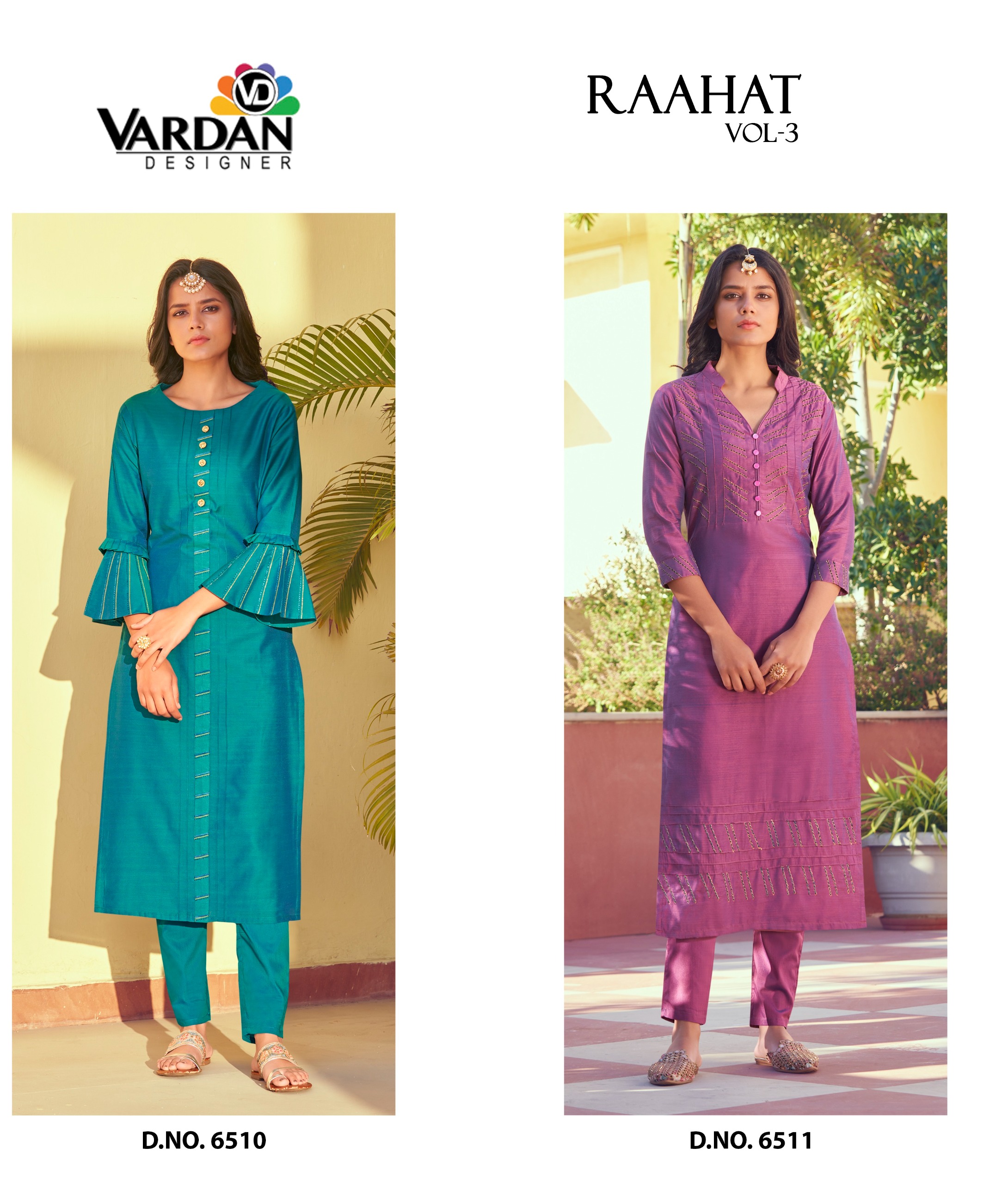 Buy Online Raahat Vol 3 By Vardan Designer Fancy Kurti With Pant 2 Pcs of Full Catalogue at Wholesale Price. Looking for Raahat Vol 3 By Vardan Designer Fancy Kurti With Pant Full Catalouge at Best Price? Buy Now Raahat Vol 3 By Vardan Designer Fancy Kurti With Pant at Wholesale Rate of Rs 1390 with Total 2 Pcs from authroized dealer and supplier of VARDAN DESIGNER Brand. Cost of Each piece is just only Rs 695 which is very low and affordable price to resale the product in your retail store ,This is Surat based Wholesale Supplier & Dealer of VARDAN DESIGNER Brand. Click on Brand name to Know more about VARDAN DESIGNER Brand's products.Call or Whatsapp on 9898838984 for booking or enquiry