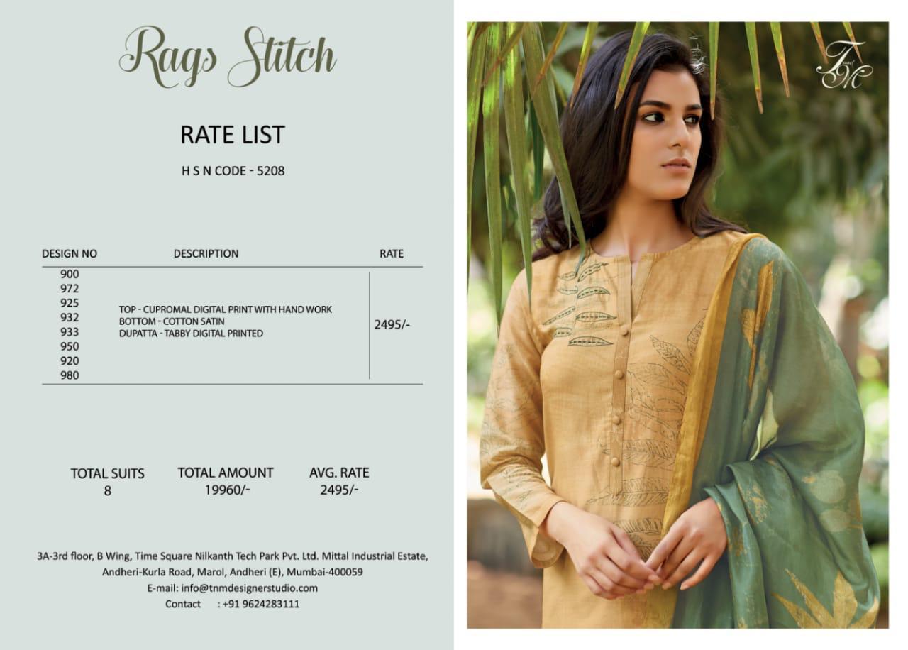 Buy Online Rags Stitch By T And M Cupromal Digital Printed Suits Wholesale Supplier India 8 Pcs of Full Catalogue at Wholesale Price. Looking for Rags Stitch By T And M Cupromal Digital Printed Suits Wholesale Supplier India Full Catalouge at Best Price? Buy Now Rags Stitch By T And M Cupromal Digital Printed Suits Wholesale Supplier India at Wholesale Rate of Rs 19960 with Total 8 Pcs from authroized dealer and supplier of Brand. Cost of Each piece is just only Rs 2495 which is very low and affordable price to resale the product in your retail store ,This is Surat based Wholesale Supplier & Dealer of Brand. Click on Brand name to Know more about Brand's products.Call or Whatsapp on 9898838984 for booking or enquiry