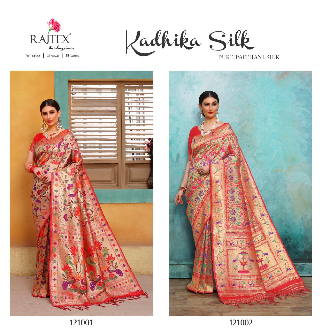 Buy Online Rajtex Kaadhika Silk Series 121001 Silk Sarees Wholesale Supplier Gujarat 2 Pcs of Full Catalogue at Wholesale Price. Looking for Rajtex Kaadhika Silk Series 121001 Silk Sarees Wholesale Supplier Gujarat Full Catalouge at Best Price? Buy Now Rajtex Kaadhika Silk Series 121001 Silk Sarees Wholesale Supplier Gujarat at Wholesale Rate of Rs 3990 with Total 2 Pcs from authroized dealer and supplier of RAJTEX Brand. Cost of Each piece is just only Rs 1995 which is very low and affordable price to resale the product in your retail store ,This is Surat based Wholesale Supplier & Dealer of RAJTEX Brand. Click on Brand name to Know more about RAJTEX Brand's products.Call or Whatsapp on 9898838984 for booking or enquiry