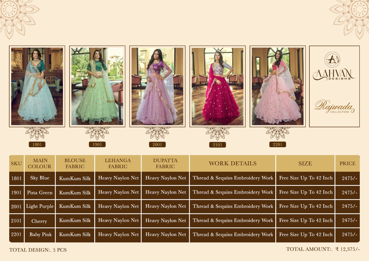 Buy Online Rajwada By Aahvan Designs 5 Pcs of Full Catalogue at Wholesale Price. Looking for Rajwada By Aahvan Designs Full Catalouge at Best Price? Buy Now Rajwada By Aahvan Designs at Wholesale Rate of Rs 12375 with Total 5 Pcs from authroized dealer and supplier of Brand. Cost of Each piece is just only Rs 2475 which is very low and affordable price to resale the product in your retail store ,This is Surat based Wholesale Supplier & Dealer of Brand. Click on Brand name to Know more about Brand's products.Call or Whatsapp on 9898838984 for booking or enquiry