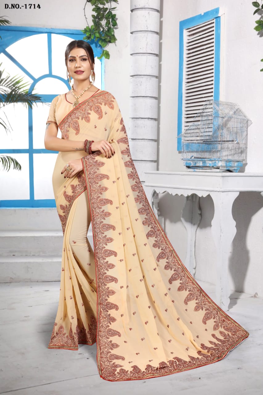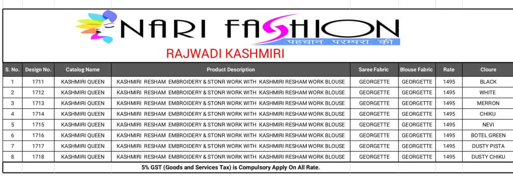 Buy Online Rajwadi Kashmiri By Naree Fashion Series 1711 To 1718 Georgette Designer Party Wear Sarees Wholesale Supplier Gujarat 8 Pcs of Full Catalogue at Wholesale Price. Looking for Rajwadi Kashmiri By Naree Fashion Series 1711 To 1718 Georgette Designer Party Wear Sarees Wholesale Supplier Gujarat Full Catalouge at Best Price? Buy Now Rajwadi Kashmiri By Naree Fashion Series 1711 To 1718 Georgette Designer Party Wear Sarees Wholesale Supplier Gujarat at Wholesale Rate of Rs 11960 with Total 8 Pcs from authroized dealer and supplier of BRAND'S Brand. Cost of Each piece is just only Rs 1495 which is very low and affordable price to resale the product in your retail store ,This is Surat based Wholesale Supplier & Dealer of BRAND'S Brand. Click on Brand name to Know more about BRAND'S Brand's products.Call or Whatsapp on 9898838984 for booking or enquiry