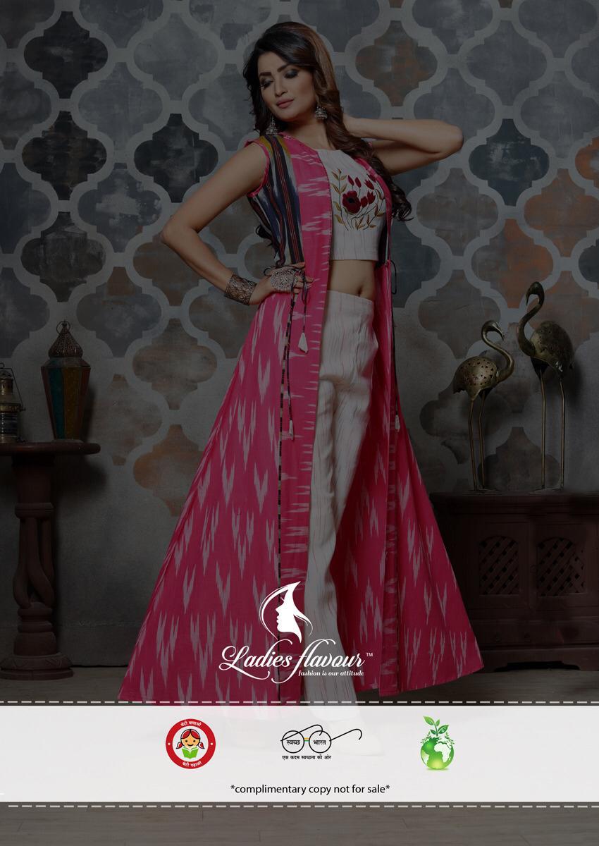 ? *Ladies Flavour* ? Brand Name : *Ladies Flavour* Catalog : *Ram-Leela vol 3* Design : *6* Fabric : *Pure handloom ikkat - South handloom coton With Hand work* Size : *M(38),L(40), XL(42) , 2XL(44)* Length :- *56"* Rate :- *1095/-* Set To Set. GST Extra . Dispatch :- *today * Note :- *Sleeve Attached* *Dry clean only* Regards *Vahanvati Enterprise* |