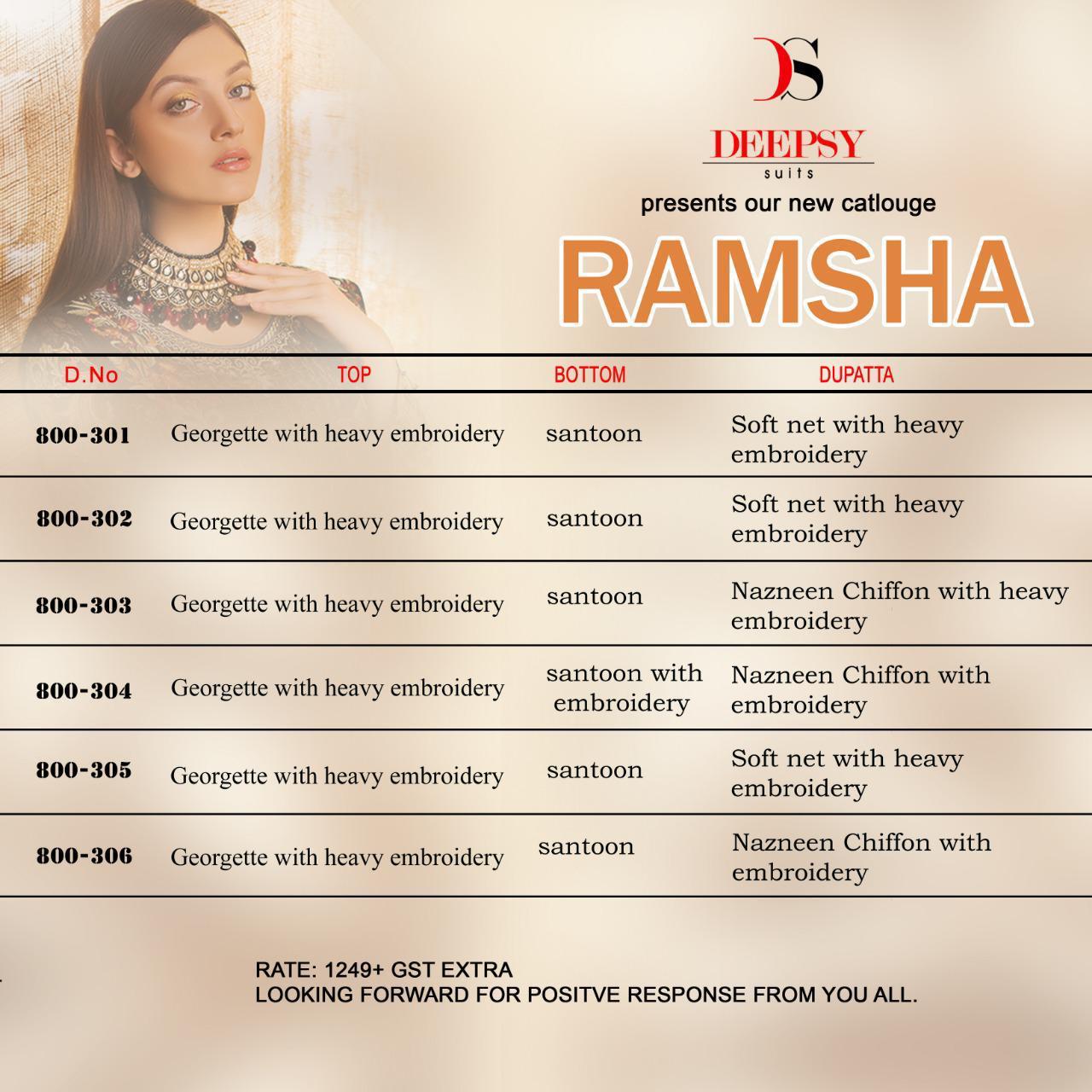 *DEEPSY SUITS* Presents its new catalogue *RAMSHA* TOP-GEORGET WITH HEAVY EMBROIDERY BOTTOM-SANTOON DUPATTA-NETT/NAZNEEN CHIFFON WITH HEAVY EMBROIDERY *1249?* 5%GST APPLICABLE SET TO SET DELIVERY 2-3 DAYS |