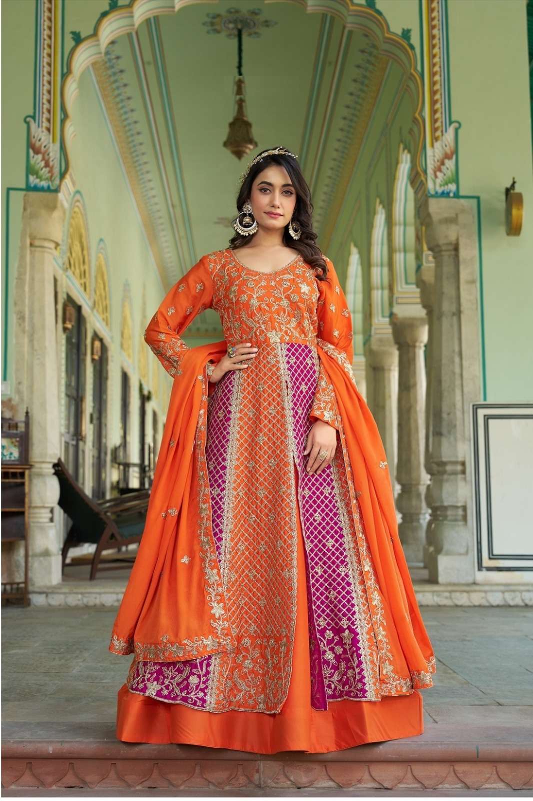 *TOP* - Chinon (free size *XXL(44+2 margin)* , ready made)* *Work* - Front & Back Heavy embroidery & Stone Work. *DUPTTA* - Chinon. *note* - readymade --------------------------------------------------- D.NO. RATE. *3096- 2750/- ₹* (top ,skirt and dupatta) *3097- 2550/- ₹* (only top and dupatta) (GST-5%EXTRA) ------------------------------