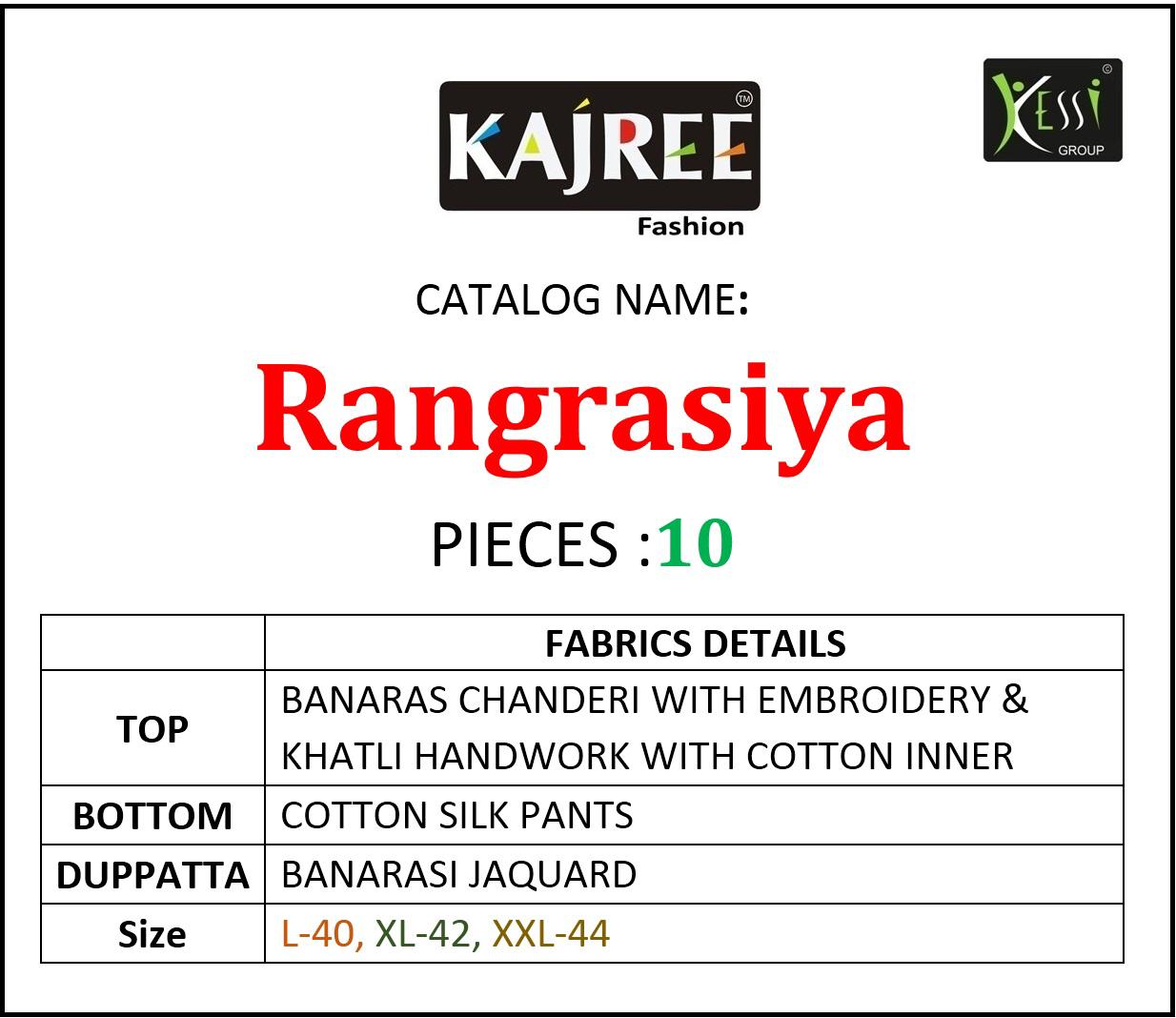 Buy Online Rangrasiya By Kajree Banarasi Embroidered Designer Ready To Wear Suits Wholesale Supplier Surat 10 Pcs of Full Catalogue at Wholesale Price. Looking for Rangrasiya By Kajree Banarasi Embroidered Designer Ready To Wear Suits Wholesale Supplier Surat Full Catalouge at Best Price? Buy Now Rangrasiya By Kajree Banarasi Embroidered Designer Ready To Wear Suits Wholesale Supplier Surat at Wholesale Rate of Rs 11990 with Total 10 Pcs from authroized dealer and supplier of Brand. Cost of Each piece is just only Rs 1199 which is very low and affordable price to resale the product in your retail store ,This is Surat based Wholesale Supplier & Dealer of Brand. Click on Brand name to Know more about Brand's products.Call or Whatsapp on 9898838984 for booking or enquiry