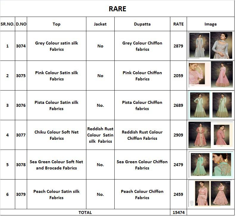Hello WISHING YOU HAPPY DIWALI .HOPE THIS DIWALI BRINGS LOTS OF PROSPERITY AND HAPPINESS... HERE IS THE AWAITED GOWN HIT DESIGNS AND COLOURS FROM OUR SUPERHIT COLLECTION 'RARE' FULLY STITCHED 40" (CAN BE ALTERED TO 36" to 42") * please note Full Stich * * set & Loose * Single Extra 100 on company price list GST 12 Percent Extra Delivery- Today CONTACT ON BELOW NUMBER |