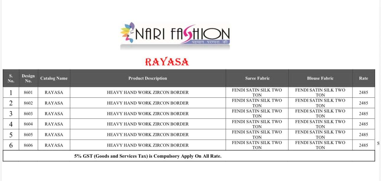 Buy Online RAYASA by nari fashion saree Collection manufacturer surat 6 Pcs of Full Catalogue at Wholesale Price. Looking for RAYASA by nari fashion saree Collection manufacturer surat Full Catalouge at Best Price? Buy Now RAYASA by nari fashion saree Collection manufacturer surat at Wholesale Rate of Rs 14910 with Total 6 Pcs from authroized dealer and supplier of Nari Fashion Brand. Cost of Each piece is just only Rs 2485 which is very low and affordable price to resale the product in your retail store ,This is Surat based Wholesale Supplier & Dealer of Nari Fashion Brand. Click on Brand name to Know more about Nari Fashion Brand's products.Call or Whatsapp on 9898838984 for booking or enquiry