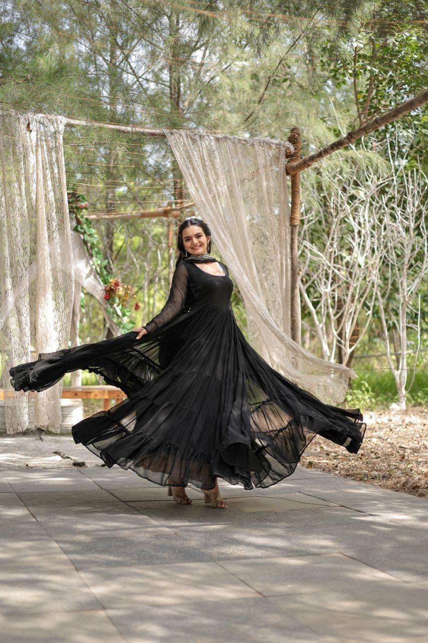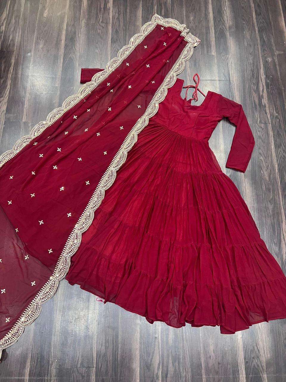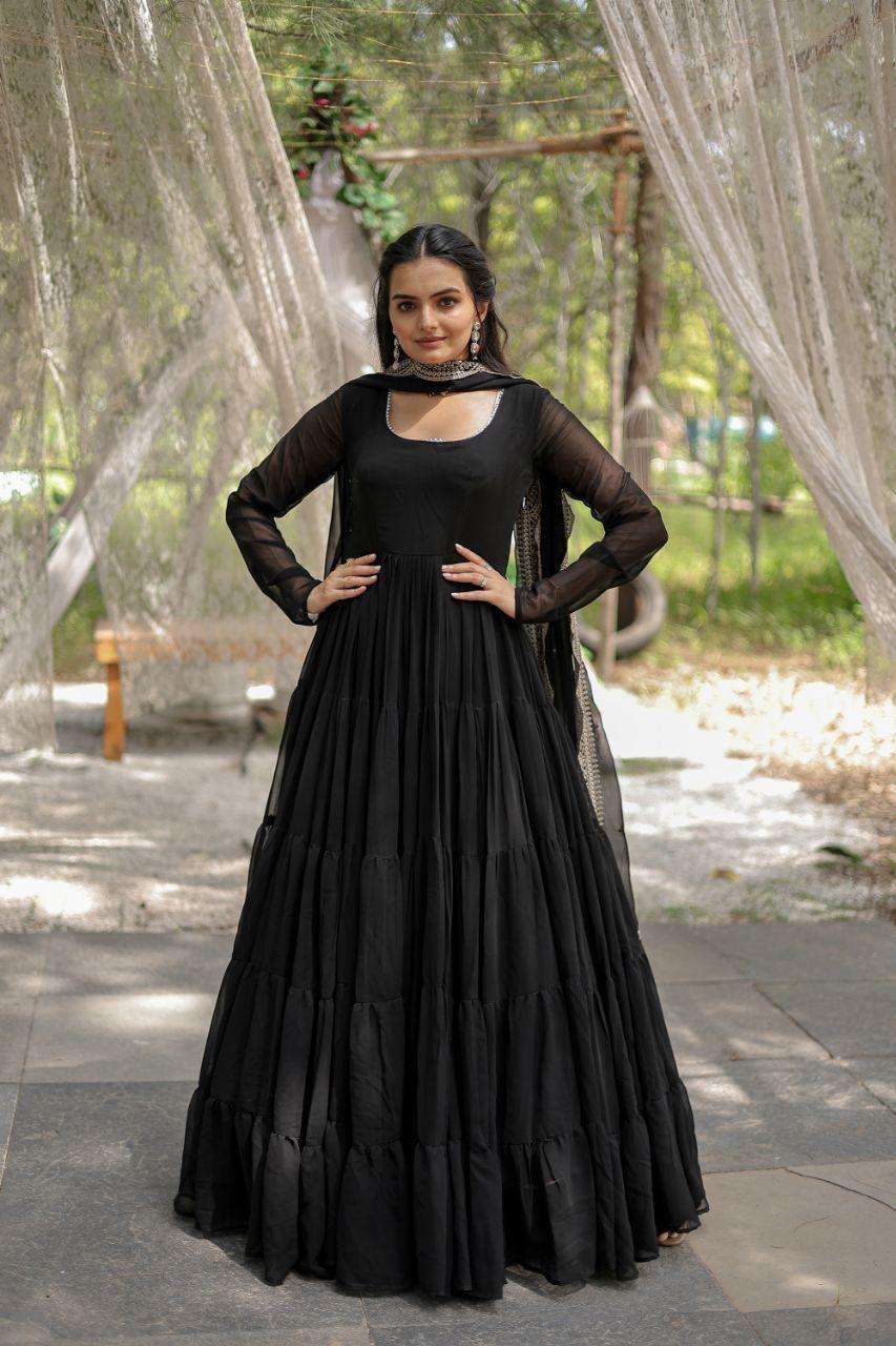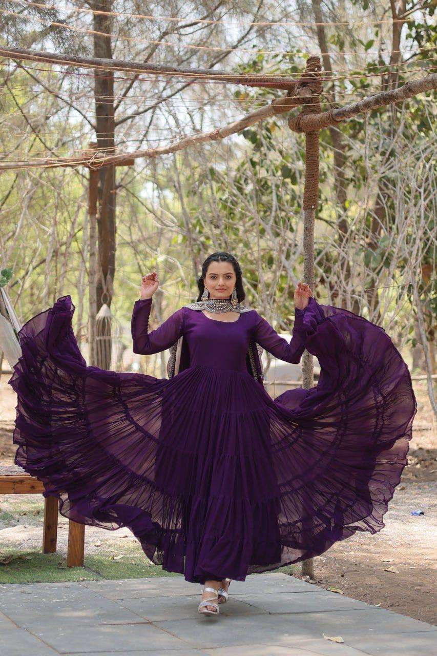 GOWN :- 👇 FABRICS & WORK :- Faux Georgette SIZE :- S(36''), M(38"), L(40"), XL(42"), XXL(44") LENGTH :- 56 INCH FLAIR :- 15 MTR LINING :- Cotton (Full Inner Top To Bottom) SLEEVES :- Full Sleeves NECK TYPE :- Round Neck STITCHING TYPE :- 5 Layer Frill Stitching