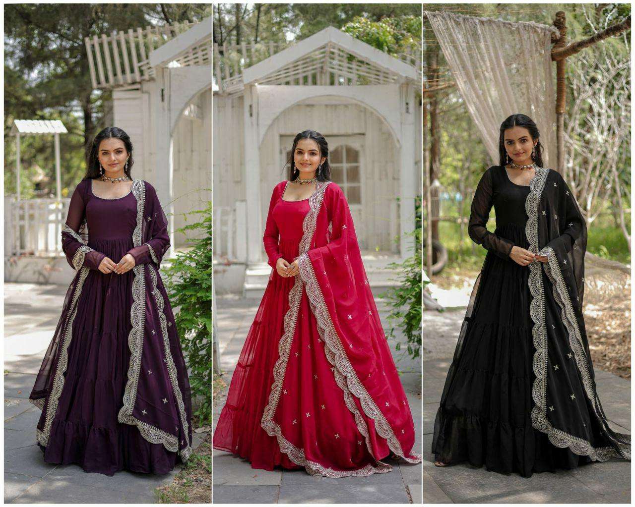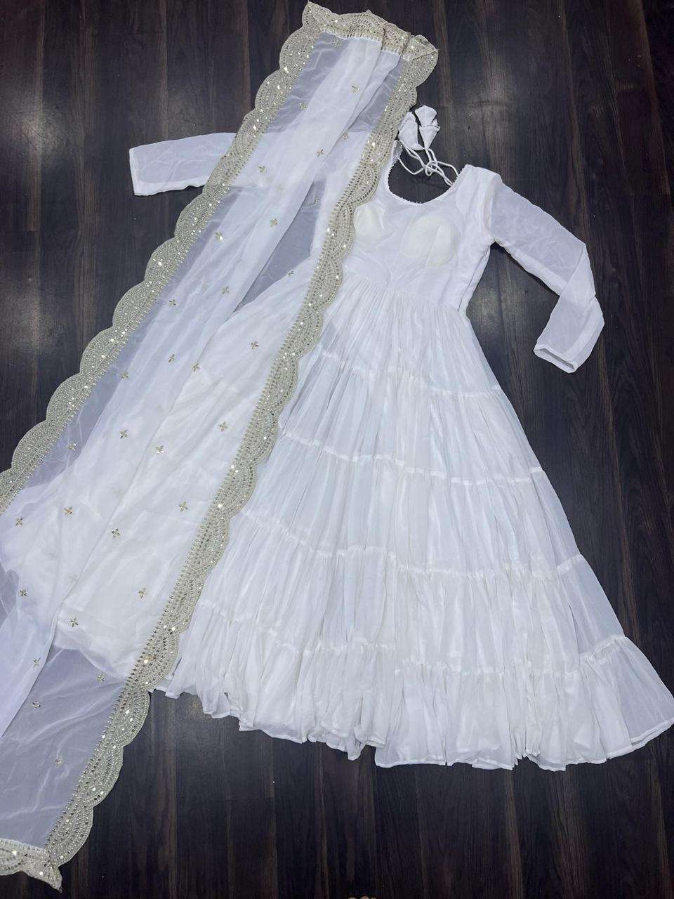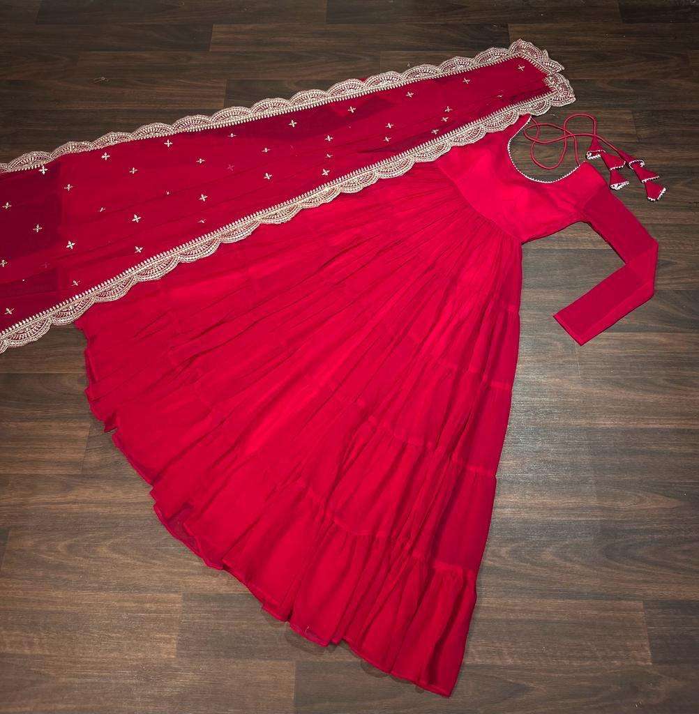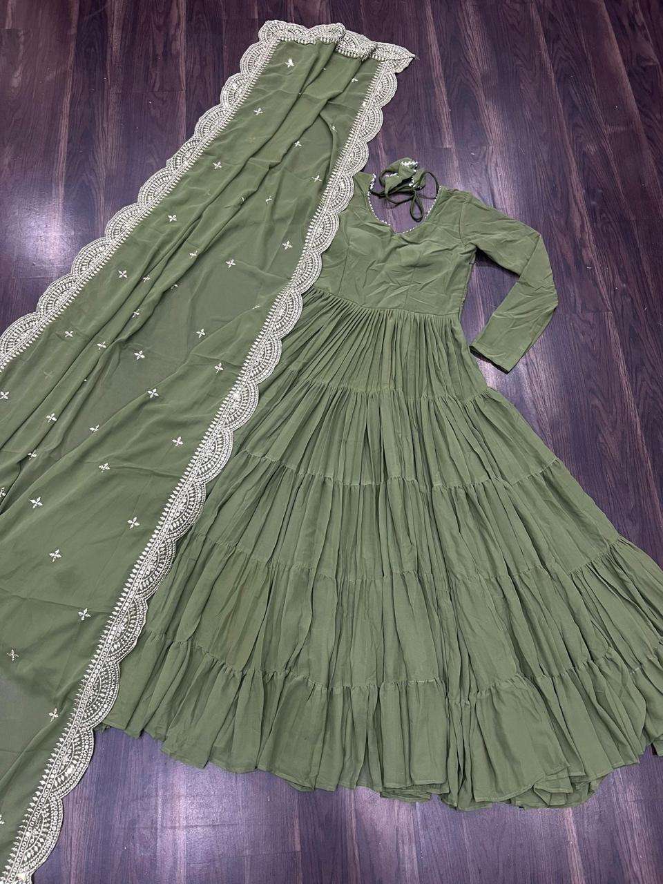 GOWN :- 👇 FABRICS & WORK :- Faux Georgette SIZE :- S(36''), M(38"), L(40"), XL(42"), XXL(44") LENGTH :- 56 INCH FLAIR :- 15 MTR LINING :- Cotton (Full Inner Top To Bottom) SLEEVES :- Full Sleeves NECK TYPE :- Round Neck STITCHING TYPE :- 5 Layer Frill Stitching