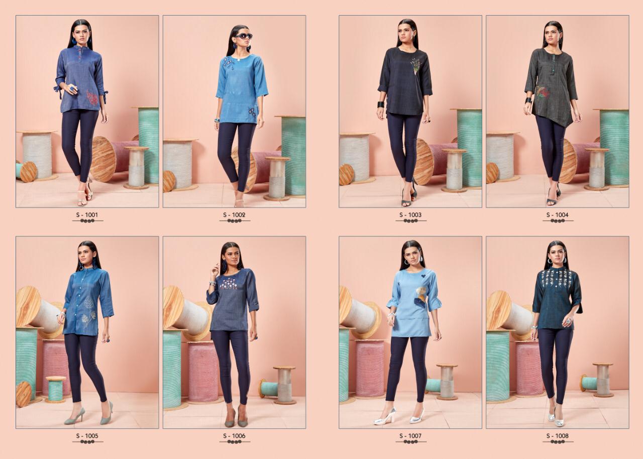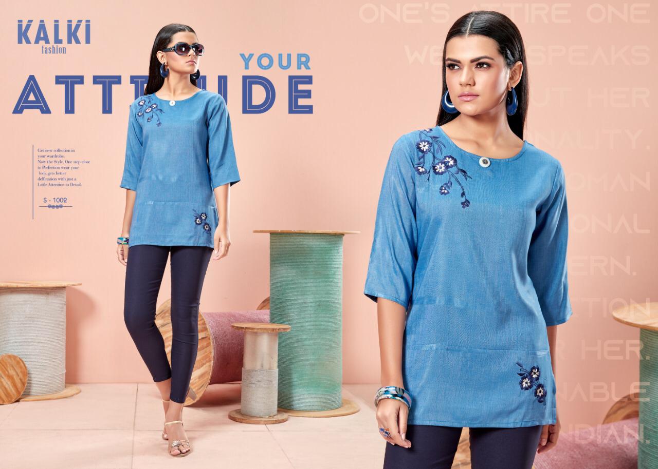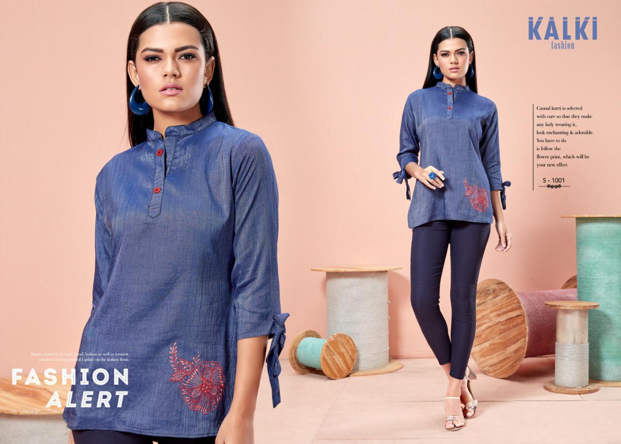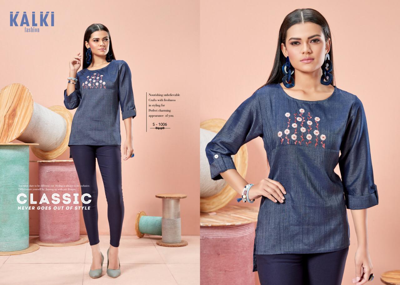 Buy Online Rida By Kalki Fashion 1001 Series Fancy Denim Pure Silk Kurti Catlog Wholesaler Surat 8 Pcs of Full Catalogue at Wholesale Price. Looking for Rida By Kalki Fashion 1001 Series Fancy Denim Pure Silk Kurti Catlog Wholesaler Surat Full Catalouge at Best Price? Buy Now Rida By Kalki Fashion 1001 Series Fancy Denim Pure Silk Kurti Catlog Wholesaler Surat at Wholesale Rate of Rs 3600 with Total 8 Pcs from authroized dealer and supplier of BRAND'S Brand. Cost of Each piece is just only Rs 450 which is very low and affordable price to resale the product in your retail store ,This is Surat based Wholesale Supplier & Dealer of BRAND'S Brand. Click on Brand name to Know more about BRAND'S Brand's products.Call or Whatsapp on 9898838984 for booking or enquiry