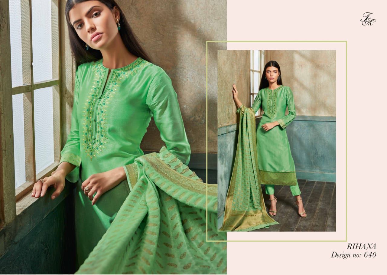 *T&M*-A sahiba brand Presents its latest upcoming beautiful designer collection *RIHANA* _Russian silk top with handwork and Daman+sleeves with gold print with cotton satin bottom and viscose jari fancy dupatta_ *2895/-* 5%Gst Applicable Set to set only Delivery 14 August,2018. *Book Now* |