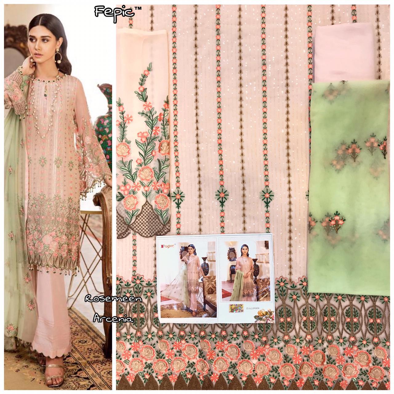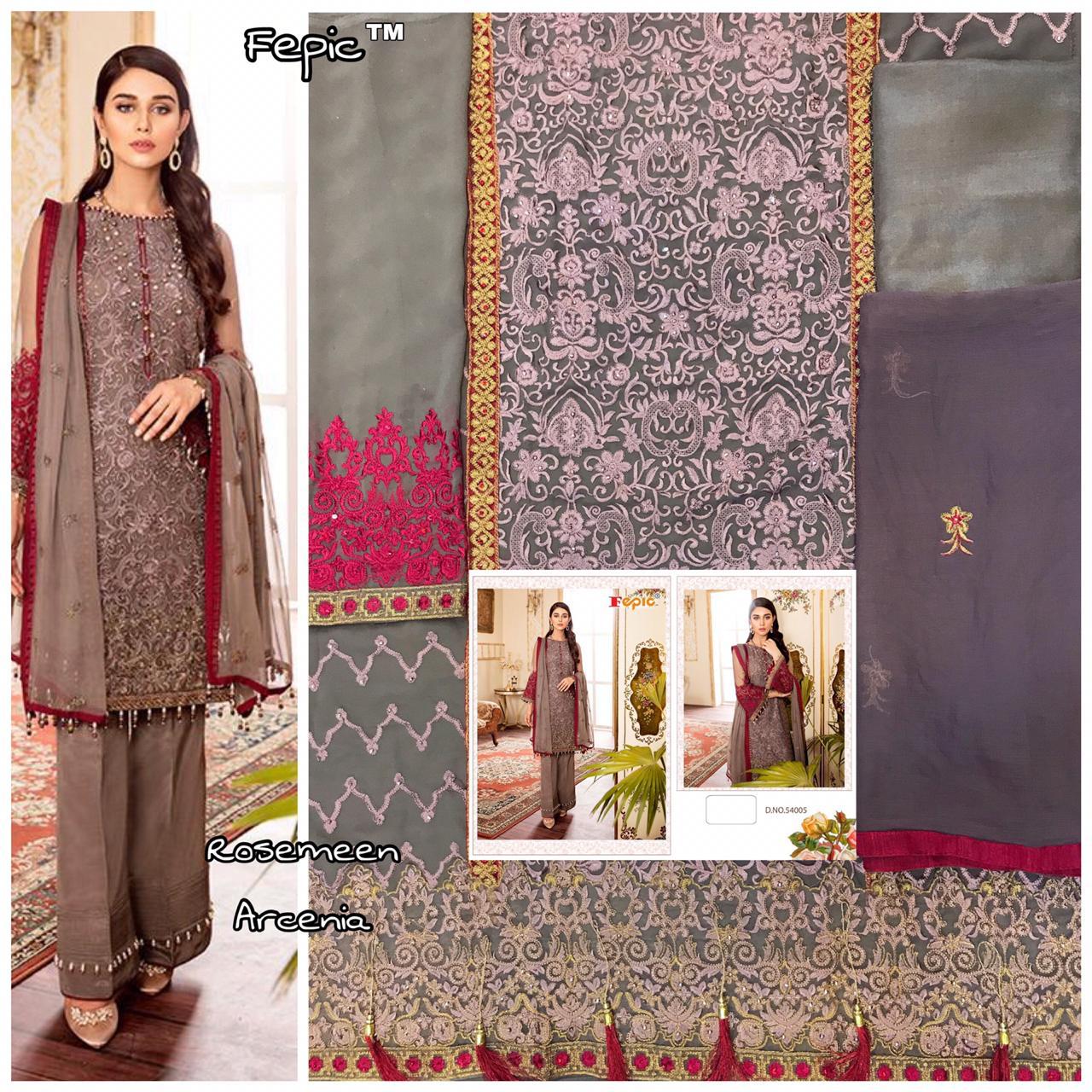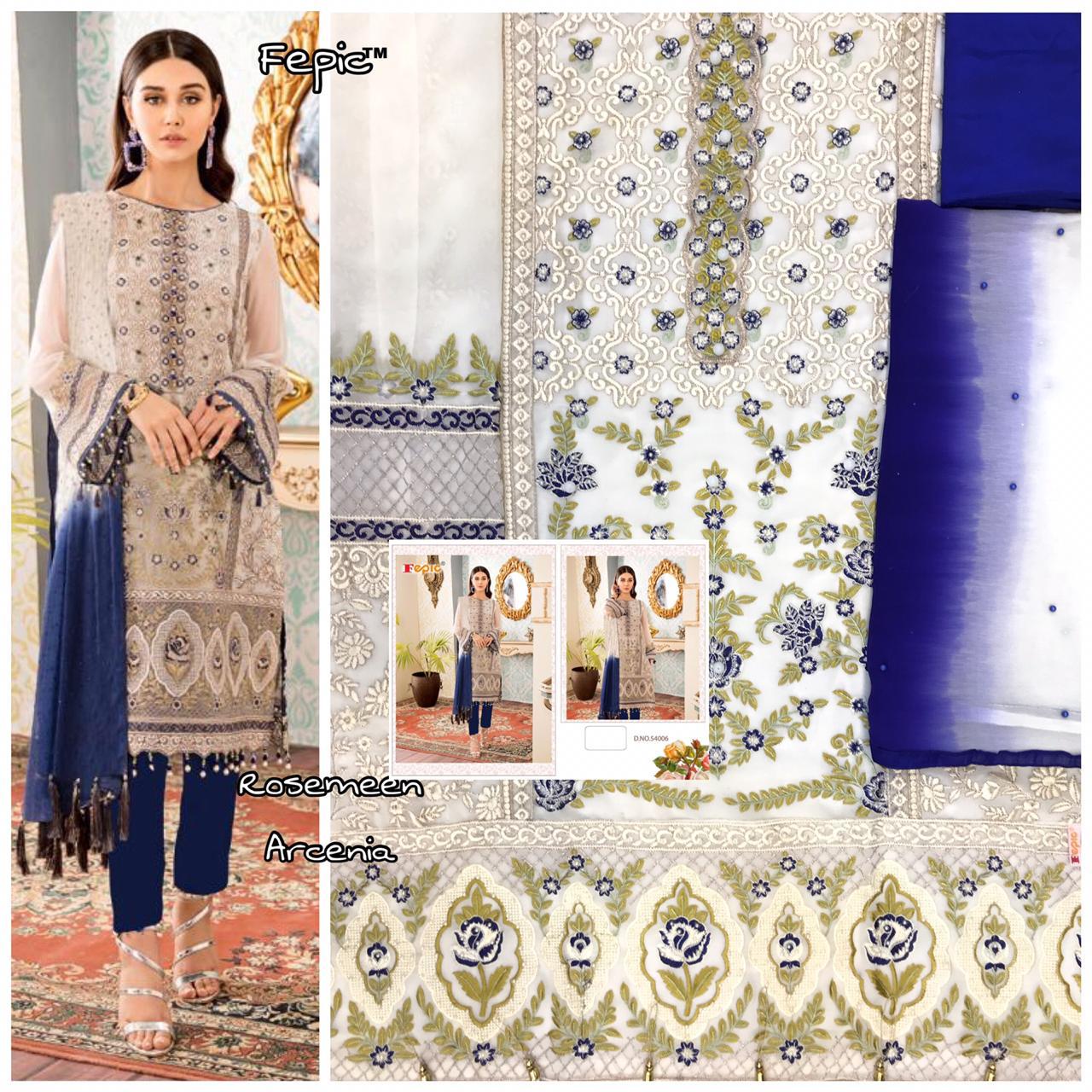Buy Online Rosemeen Arcenia By Fepic Georgette Embroidered Pakistani Suits Wholesale Supplier Gujarat 6 Pcs of Full Catalogue at Wholesale Price. Looking for Rosemeen Arcenia By Fepic Georgette Embroidered Pakistani Suits Wholesale Supplier Gujarat Full Catalouge at Best Price? Buy Now Rosemeen Arcenia By Fepic Georgette Embroidered Pakistani Suits Wholesale Supplier Gujarat at Wholesale Rate of Rs 7326 with Total 6 Pcs from authroized dealer and supplier of FEPIC Brand. Cost of Each piece is just only Rs 1221 which is very low and affordable price to resale the product in your retail store ,This is Surat based Wholesale Supplier & Dealer of FEPIC Brand. Click on Brand name to Know more about FEPIC Brand's products.Call or Whatsapp on 9898838984 for booking or enquiry