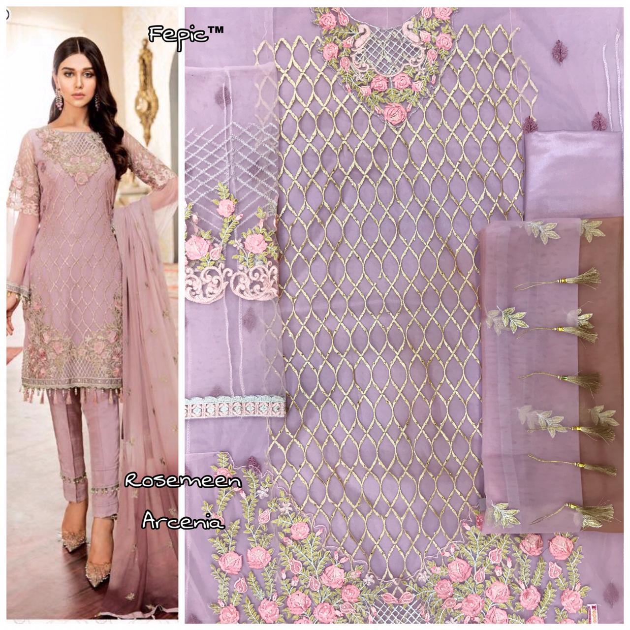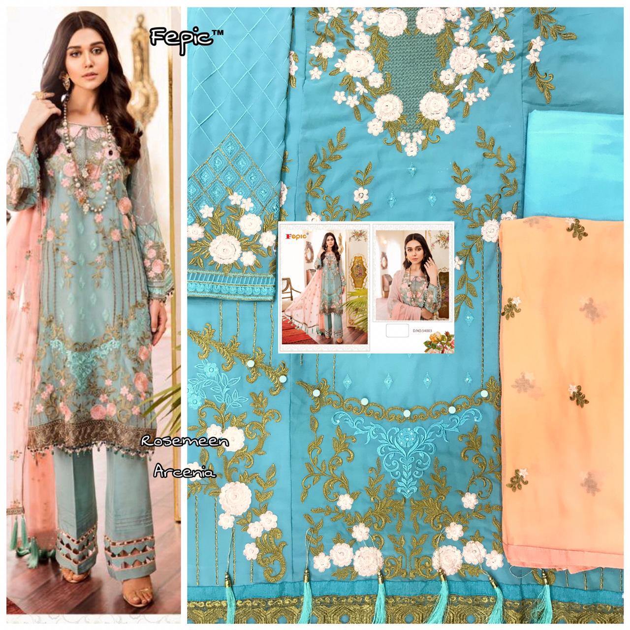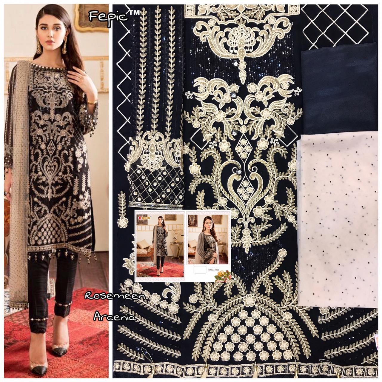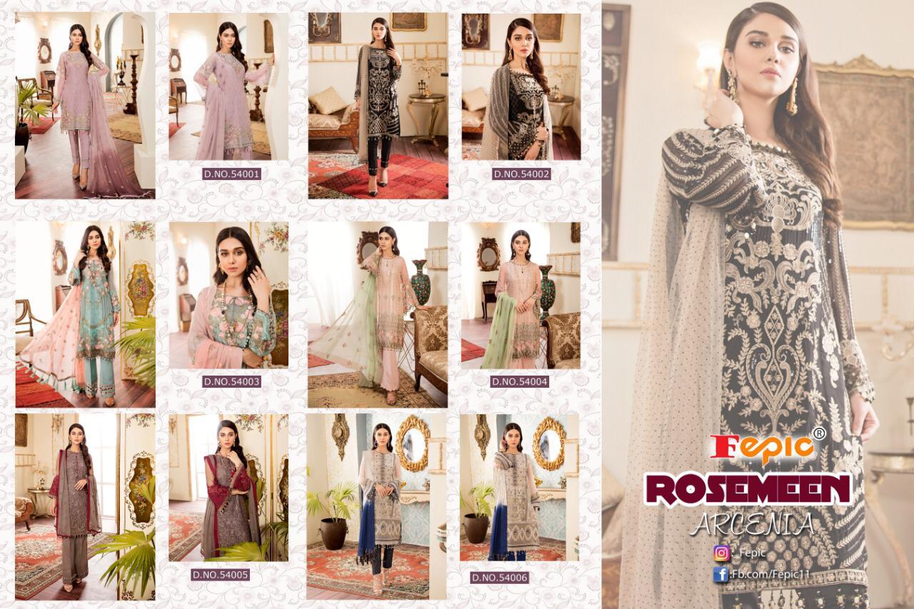 Buy Online Rosemeen Arcenia By Fepic Georgette Embroidered Pakistani Suits Wholesale Supplier Gujarat 6 Pcs of Full Catalogue at Wholesale Price. Looking for Rosemeen Arcenia By Fepic Georgette Embroidered Pakistani Suits Wholesale Supplier Gujarat Full Catalouge at Best Price? Buy Now Rosemeen Arcenia By Fepic Georgette Embroidered Pakistani Suits Wholesale Supplier Gujarat at Wholesale Rate of Rs 7326 with Total 6 Pcs from authroized dealer and supplier of FEPIC Brand. Cost of Each piece is just only Rs 1221 which is very low and affordable price to resale the product in your retail store ,This is Surat based Wholesale Supplier & Dealer of FEPIC Brand. Click on Brand name to Know more about FEPIC Brand's products.Call or Whatsapp on 9898838984 for booking or enquiry