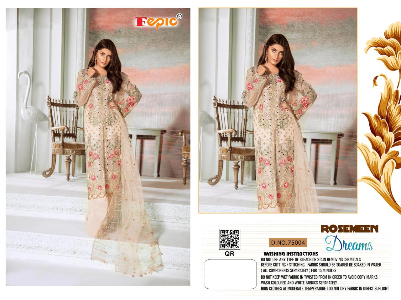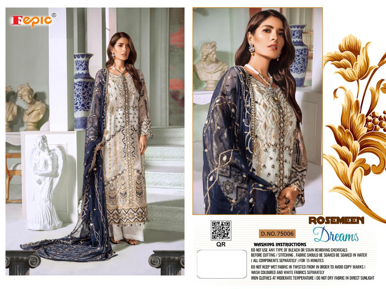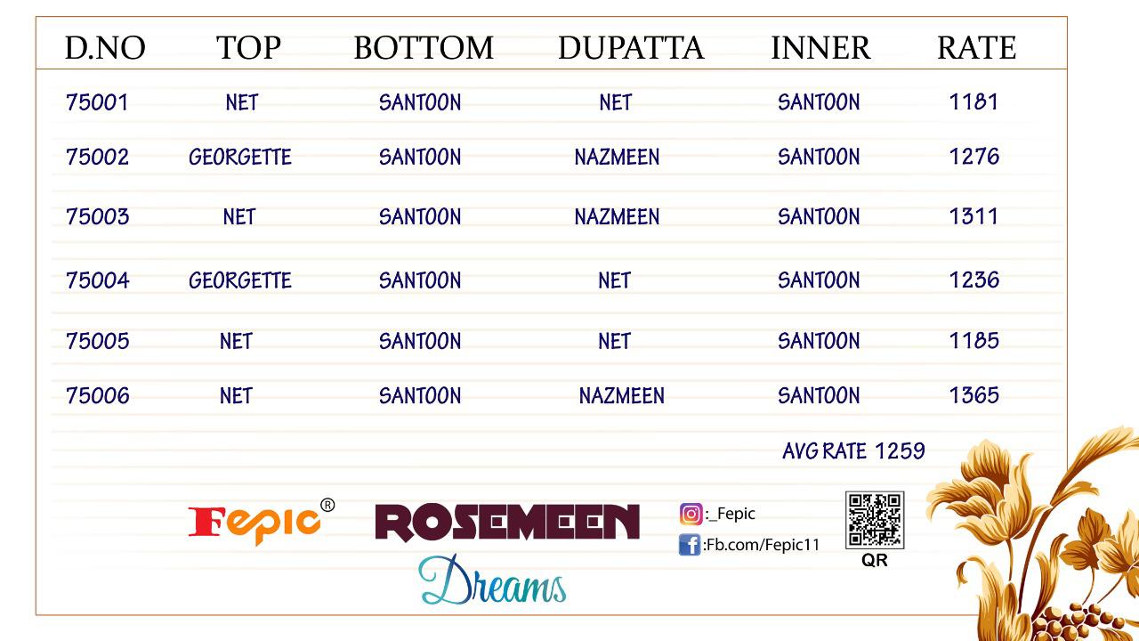 Buy Online Rosemeen Dreams By Fepic Pakistani Suits Wholesale Supplier Gujarat 6 Pcs of Full Catalogue at Wholesale Price. Looking for Rosemeen Dreams By Fepic Pakistani Suits Wholesale Supplier Gujarat Full Catalouge at Best Price? Buy Now Rosemeen Dreams By Fepic Pakistani Suits Wholesale Supplier Gujarat at Wholesale Rate of Rs 7554 with Total 6 Pcs from authroized dealer and supplier of FEPIC Brand. Cost of Each piece is just only Rs 1259 which is very low and affordable price to resale the product in your retail store ,This is Surat based Wholesale Supplier & Dealer of FEPIC Brand. Click on Brand name to Know more about FEPIC Brand's products.Call or Whatsapp on 9898838984 for booking or enquiry