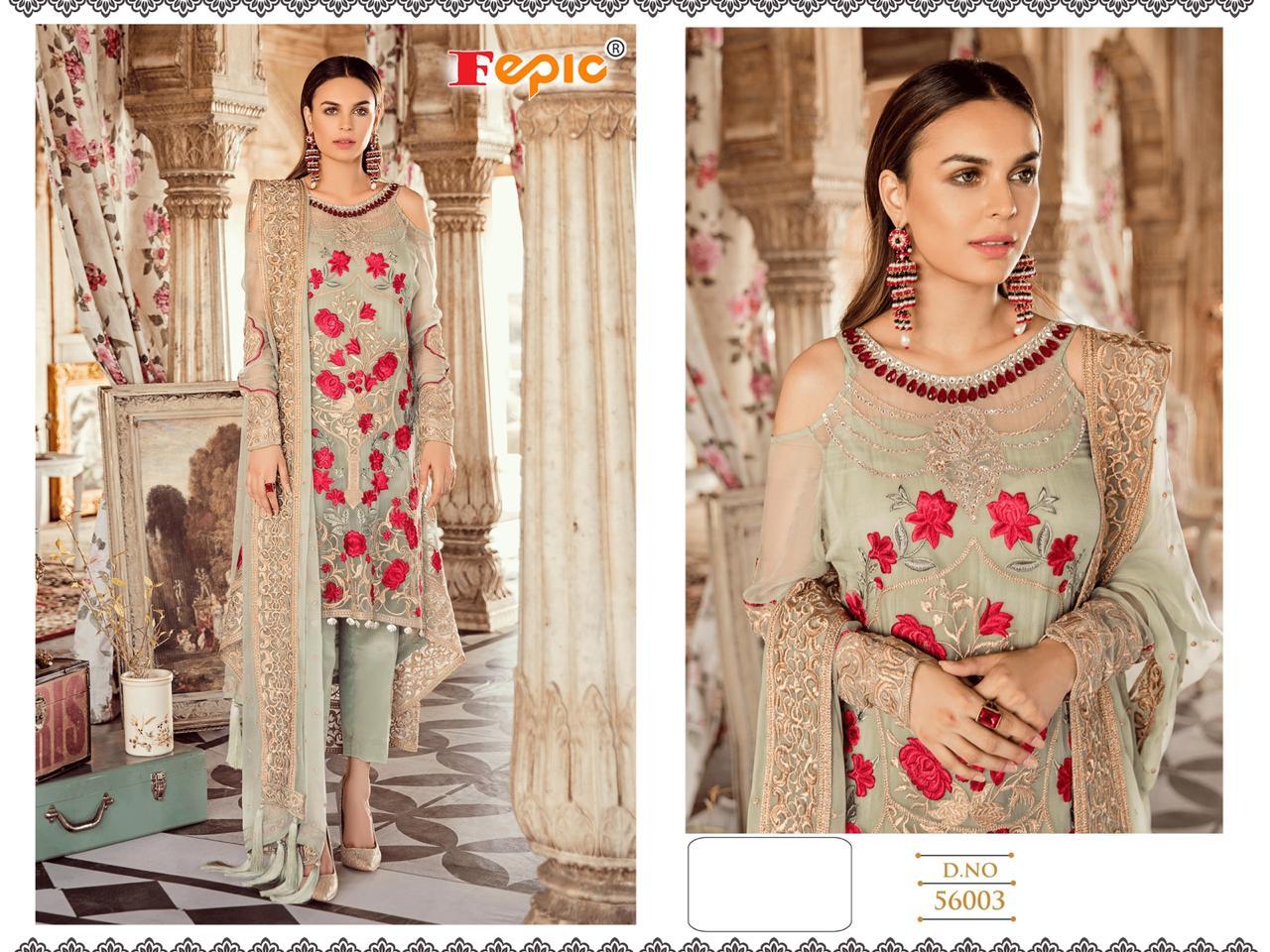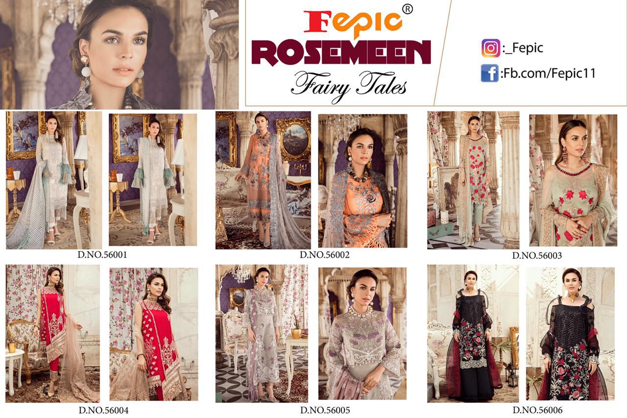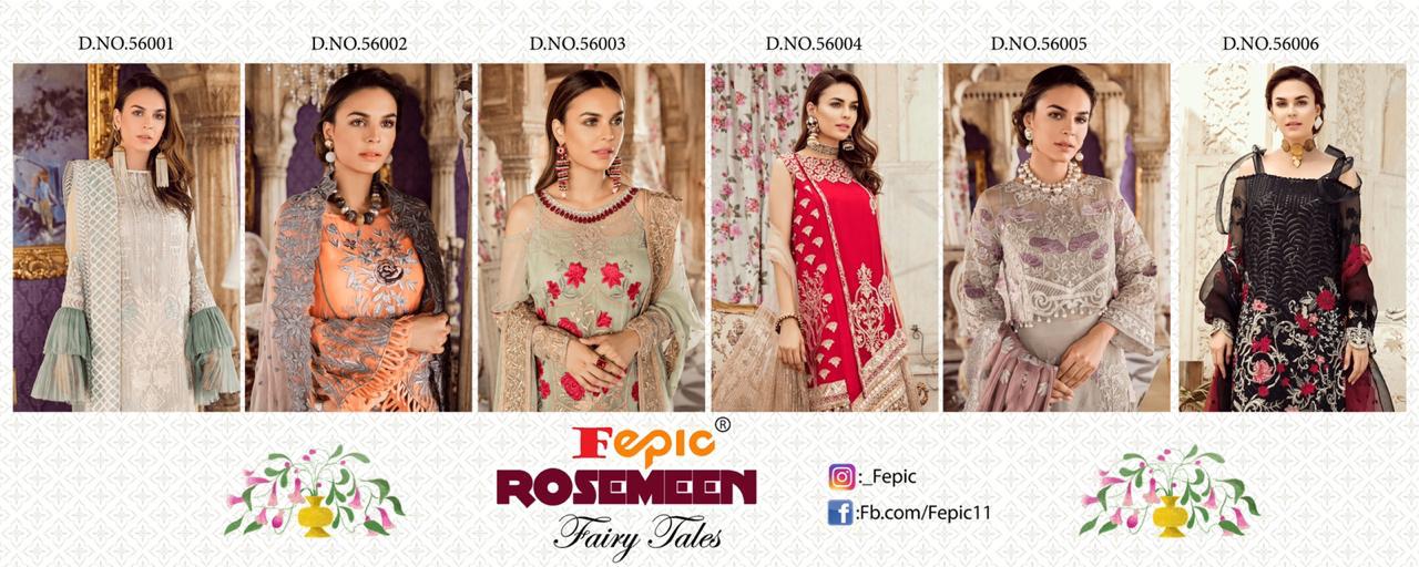 Buy Online Rosemeen Fairy Tales By Fepic Series 56001 To 56006 Georgette Embroidered Pakistani Suits Wholesale Supplier Gujarat 6 Pcs of Full Catalogue at Wholesale Price. Looking for Rosemeen Fairy Tales By Fepic Series 56001 To 56006 Georgette Embroidered Pakistani Suits Wholesale Supplier Gujarat Full Catalouge at Best Price? Buy Now Rosemeen Fairy Tales By Fepic Series 56001 To 56006 Georgette Embroidered Pakistani Suits Wholesale Supplier Gujarat at Wholesale Rate of Rs 7554 with Total 6 Pcs from authroized dealer and supplier of FEPIC Brand. Cost of Each piece is just only Rs 1259 which is very low and affordable price to resale the product in your retail store ,This is Surat based Wholesale Supplier & Dealer of FEPIC Brand. Click on Brand name to Know more about FEPIC Brand's products.Call or Whatsapp on 9898838984 for booking or enquiry