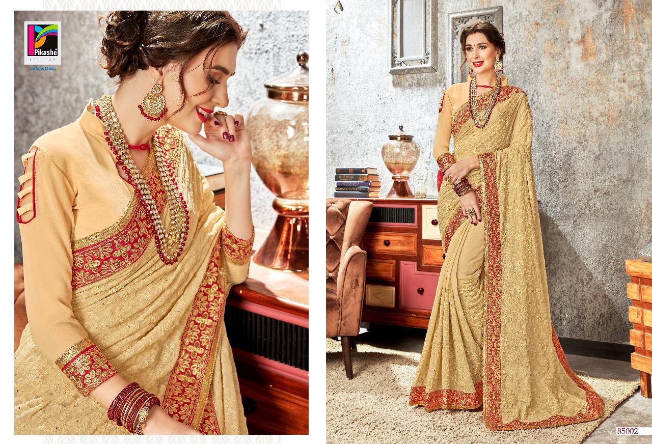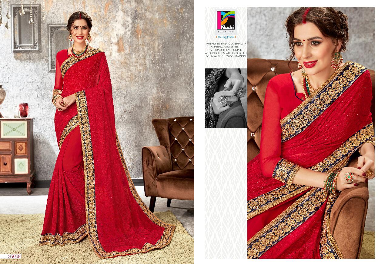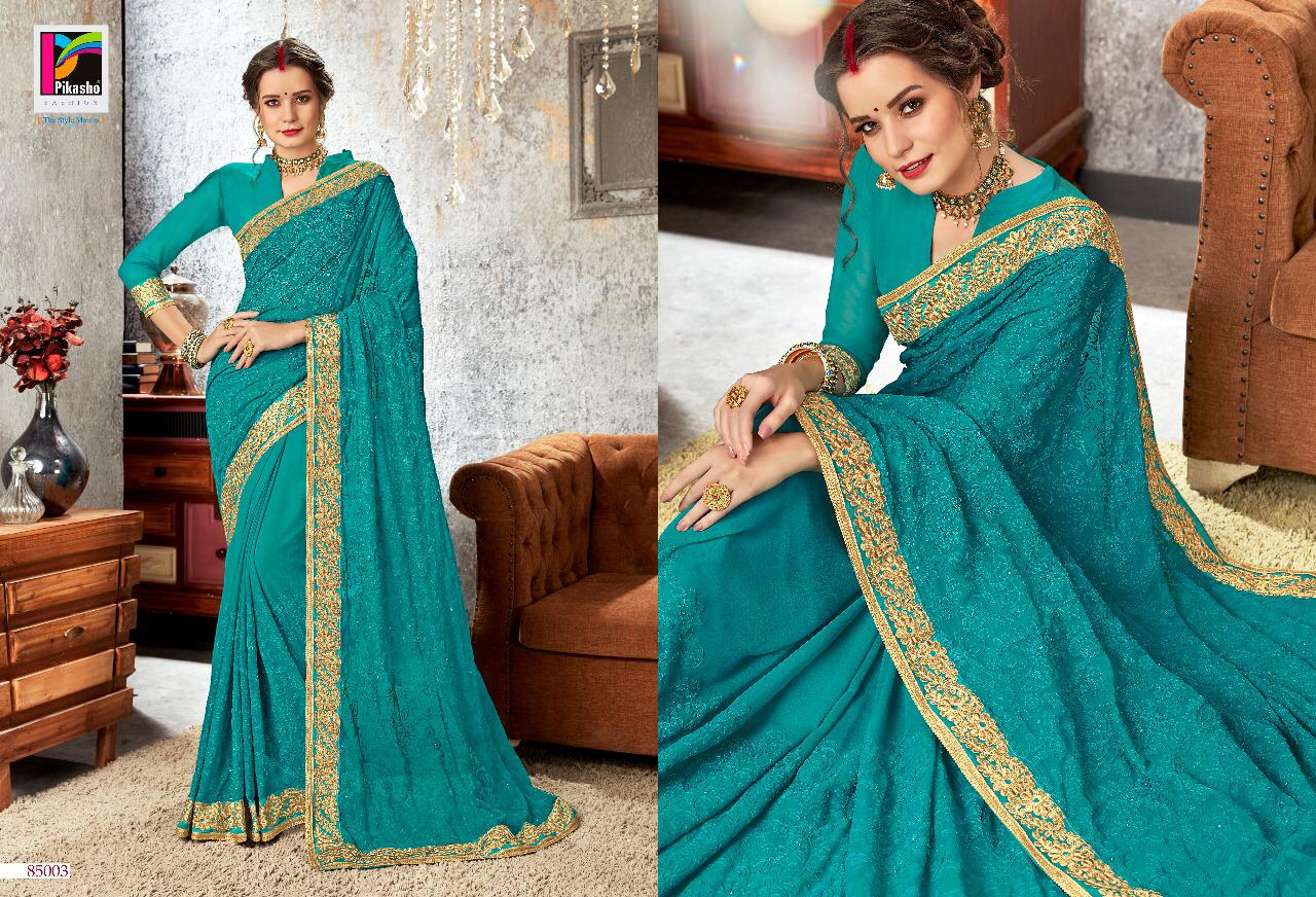 Buy Online Royalty By Pikasho 85001 Series Fancy Party Wear Saree Collection Wholesale Dealer Surat 8 Pcs of Full Catalogue at Wholesale Price. Looking for Royalty By Pikasho 85001 Series Fancy Party Wear Saree Collection Wholesale Dealer Surat Full Catalouge at Best Price? Buy Now Royalty By Pikasho 85001 Series Fancy Party Wear Saree Collection Wholesale Dealer Surat at Wholesale Rate of Rs 9200 with Total 8 Pcs from authroized dealer and supplier of Pikasho Fashion Brand. Cost of Each piece is just only Rs 1150 which is very low and affordable price to resale the product in your retail store ,This is Surat based Wholesale Supplier & Dealer of Pikasho Fashion Brand. Click on Brand name to Know more about Pikasho Fashion Brand's products.Call or Whatsapp on 9898838984 for booking or enquiry