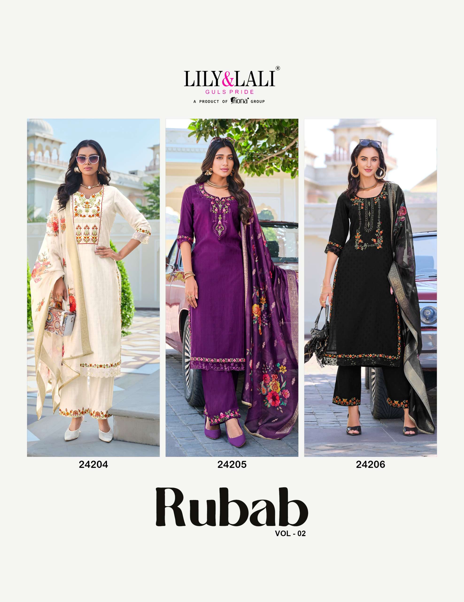 Buy Online RUBAB Vol 2 by LILY LALI JACQUARD VISCOUSE silk suit collection manufacturer surat 6 Pcs of Full Catalogue at Wholesale Price. Looking for RUBAB Vol 2 by LILY LALI JACQUARD VISCOUSE silk suit collection manufacturer surat Full Catalouge at Best Price? Buy Now RUBAB Vol 2 by LILY LALI JACQUARD VISCOUSE silk suit collection manufacturer surat at Wholesale Rate of Rs 9594 with Total 6 Pcs from authroized dealer and supplier of lily & lali Brand. Cost of Each piece is just only Rs 1599 which is very low and affordable price to resale the product in your retail store ,This is Surat based Wholesale Supplier & Dealer of lily & lali Brand. Click on Brand name to Know more about lily & lali Brand's products.Call or Whatsapp on 9898838984 for booking or enquiry