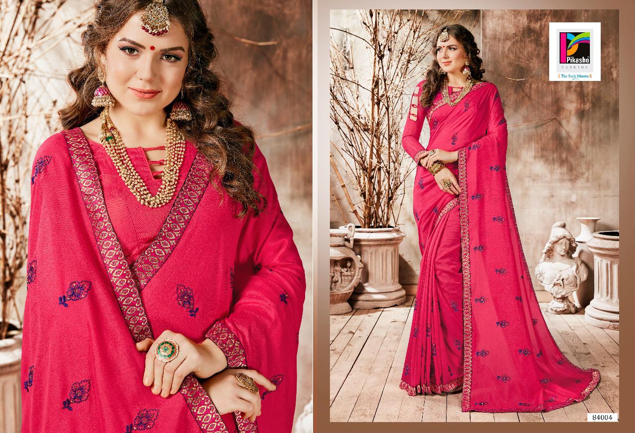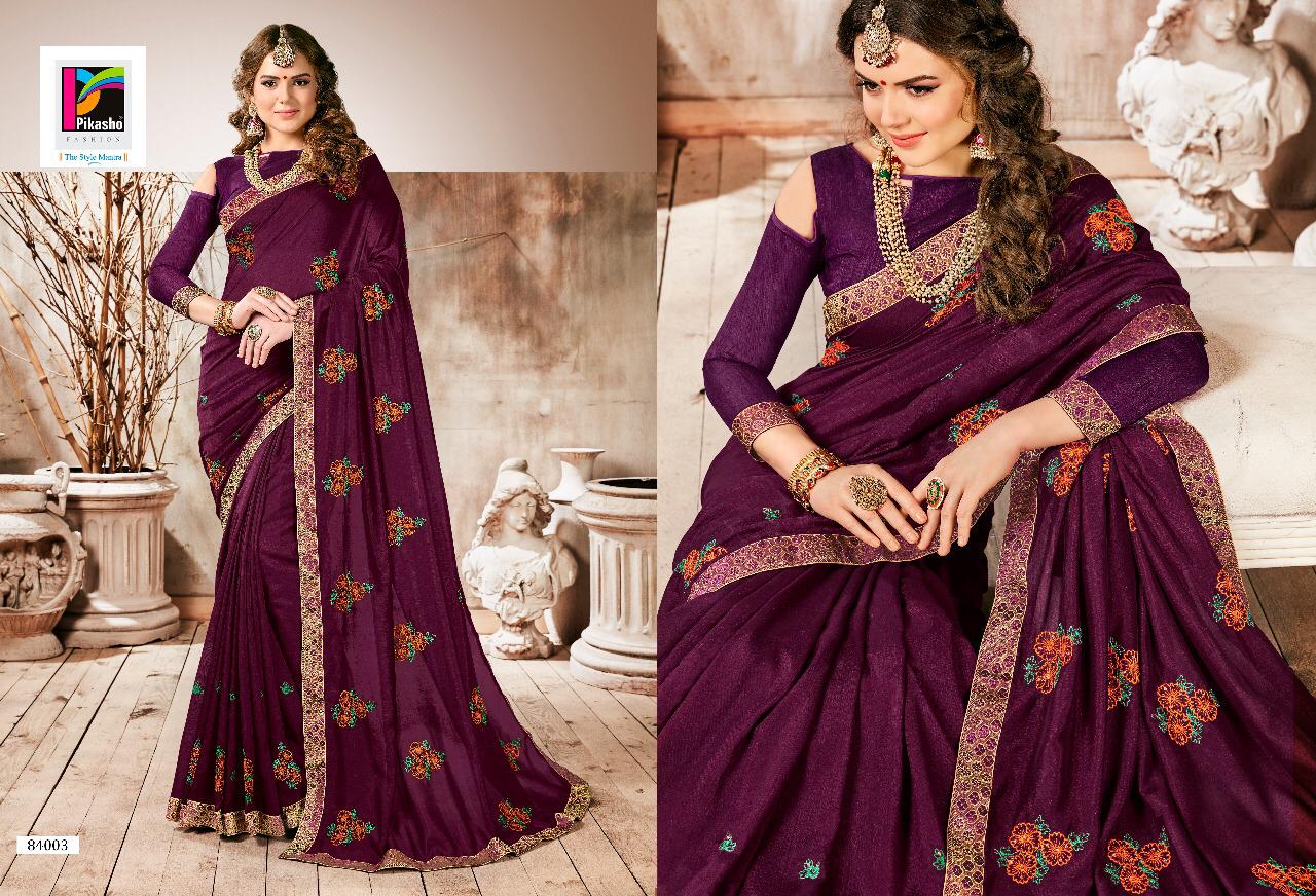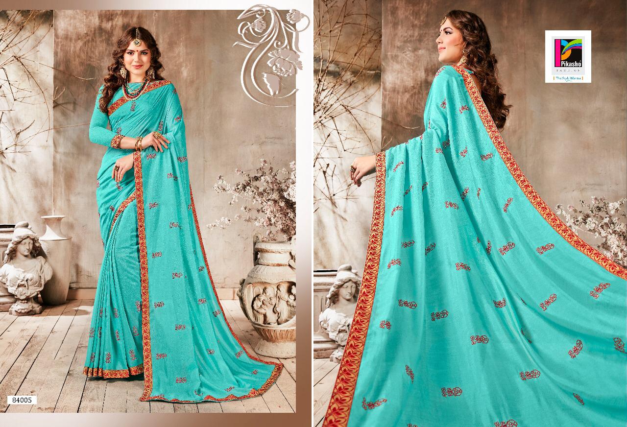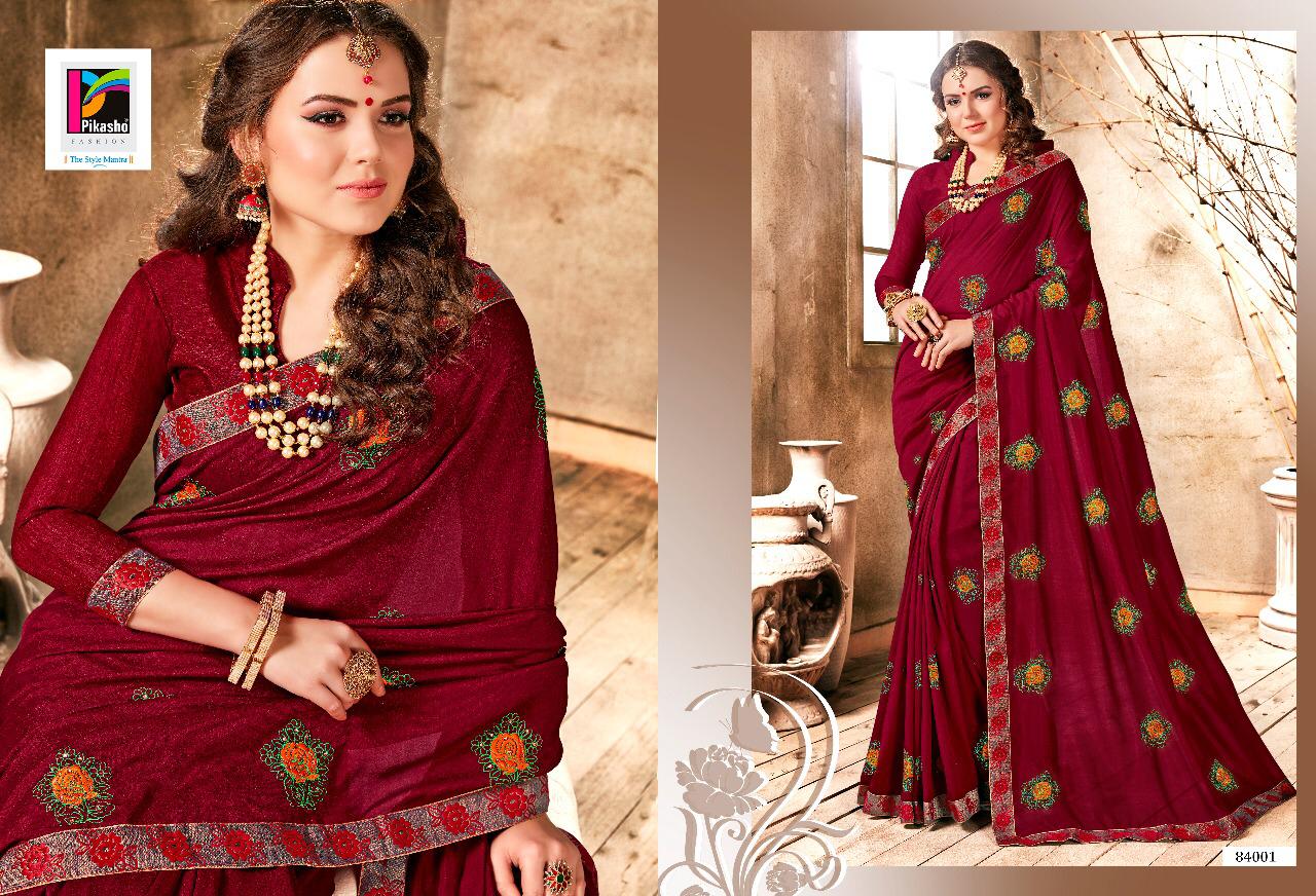 Buy Online Ruchi By Pikasho 84001 Series Fancy Party Wear Sarees Catlog Wholesaler Surat 8 Pcs of Full Catalogue at Wholesale Price. Looking for Ruchi By Pikasho 84001 Series Fancy Party Wear Sarees Catlog Wholesaler Surat Full Catalouge at Best Price? Buy Now Ruchi By Pikasho 84001 Series Fancy Party Wear Sarees Catlog Wholesaler Surat at Wholesale Rate of Rs 4760 with Total 8 Pcs from authroized dealer and supplier of Pikasho Fashion Brand. Cost of Each piece is just only Rs 595 which is very low and affordable price to resale the product in your retail store ,This is Surat based Wholesale Supplier & Dealer of Pikasho Fashion Brand. Click on Brand name to Know more about Pikasho Fashion Brand's products.Call or Whatsapp on 9898838984 for booking or enquiry