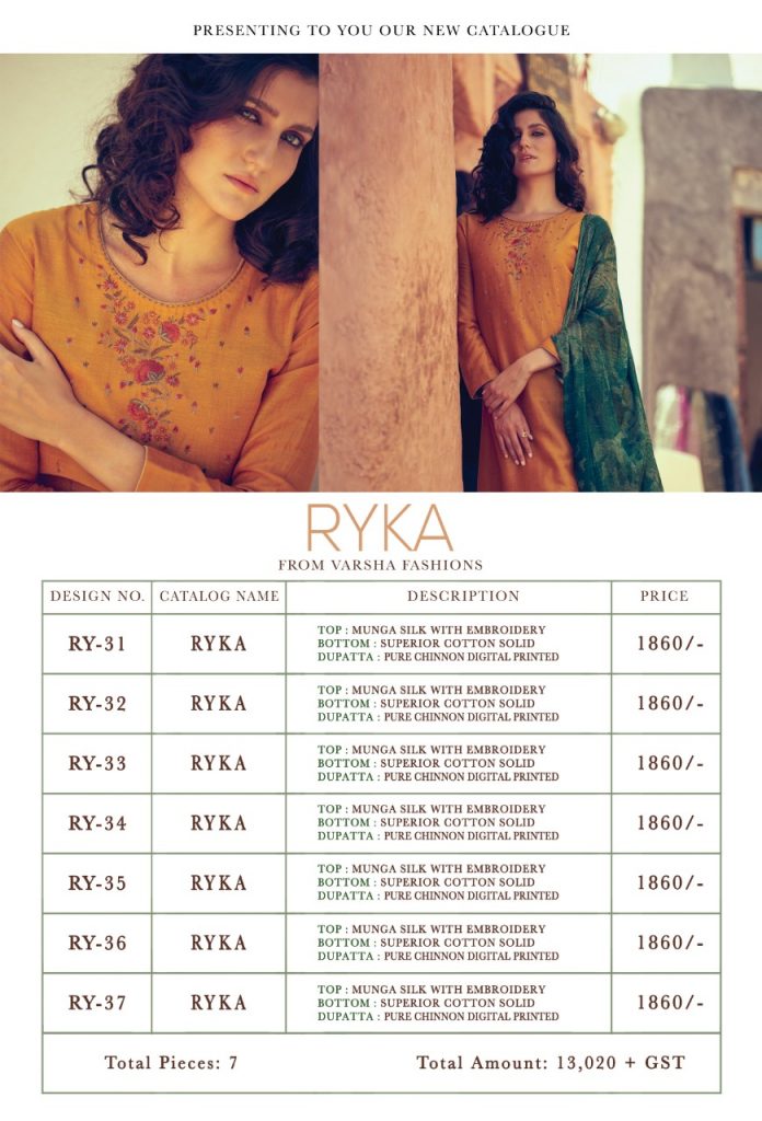 Buy Online Ryka By Varshaa Silk Designer Occasions Wear Suits Wholesale Supplier Nd Dealer Gujarat 7 Pcs of Full Catalogue at Wholesale Price. Looking for Ryka By Varshaa Silk Designer Occasions Wear Suits Wholesale Supplier Nd Dealer Gujarat Full Catalouge at Best Price? Buy Now Ryka By Varshaa Silk Designer Occasions Wear Suits Wholesale Supplier Nd Dealer Gujarat at Wholesale Rate of Rs 13020 with Total 7 Pcs from authroized dealer and supplier of Brand. Cost of Each piece is just only Rs 1860 which is very low and affordable price to resale the product in your retail store ,This is Surat based Wholesale Supplier & Dealer of Brand. Click on Brand name to Know more about Brand's products.Call or Whatsapp on 9898838984 for booking or enquiry