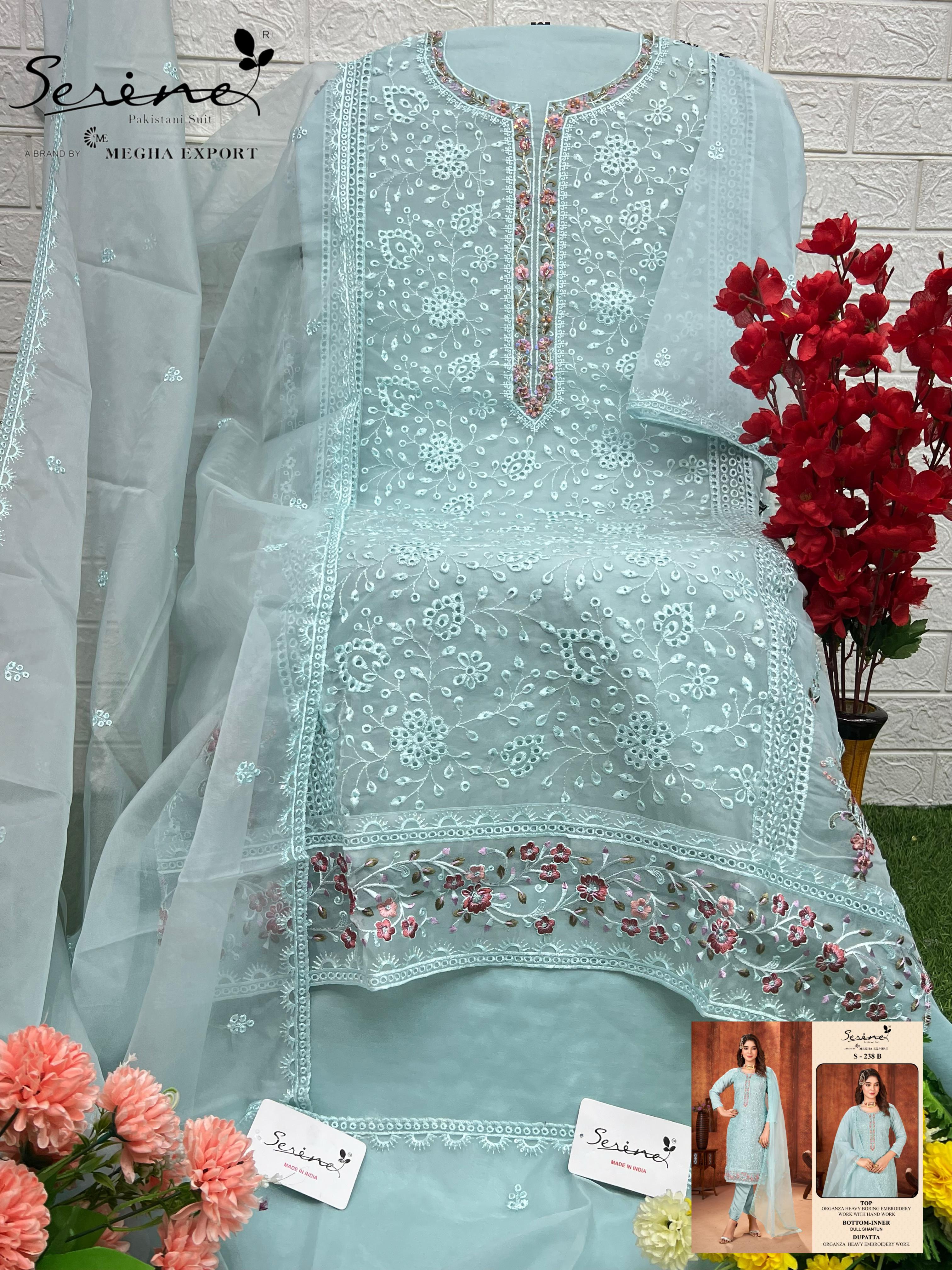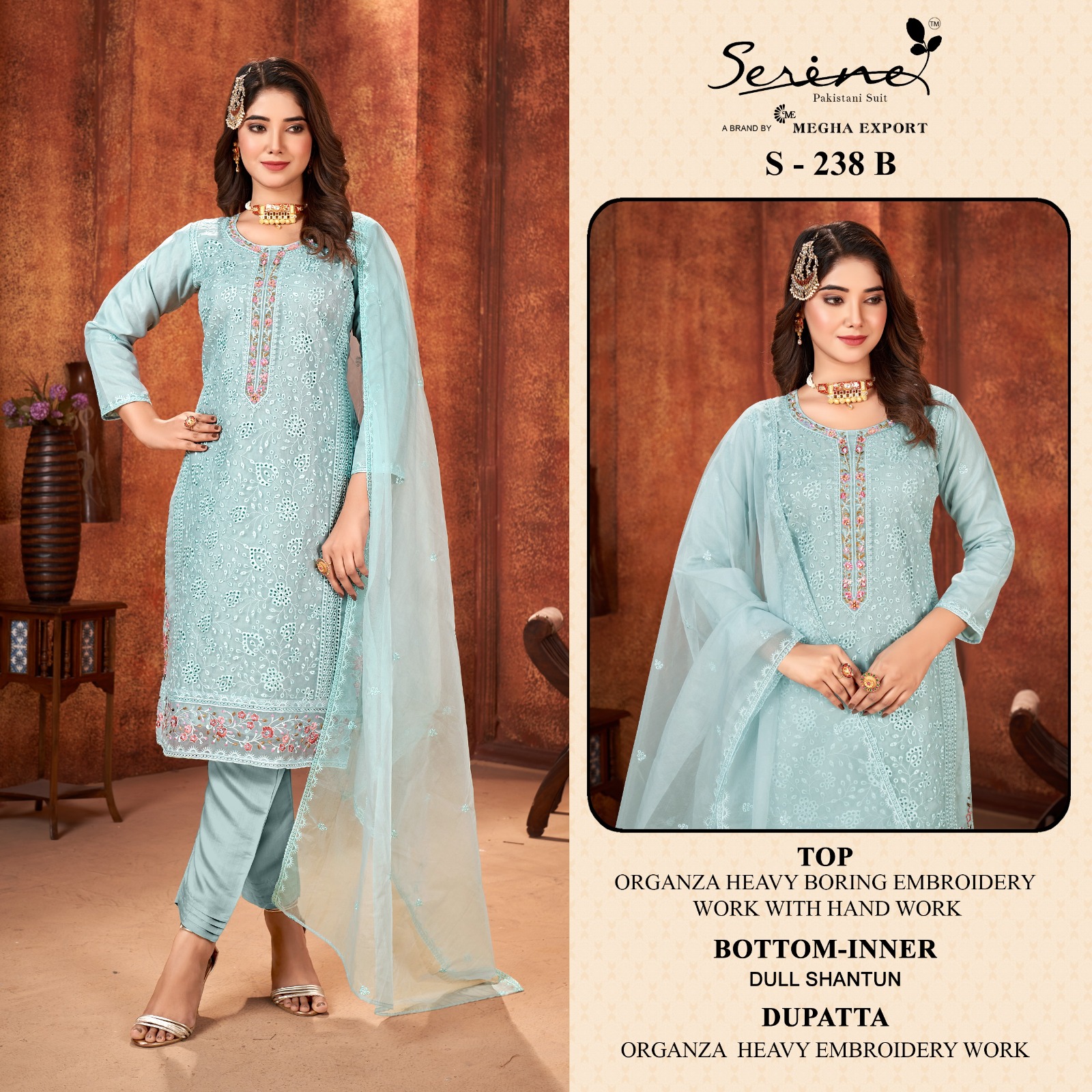 Buy Online S 238 A To D By Serine Organza Embroidery Pakistani Suits 4 Pcs of Full Catalogue at Wholesale Price. Looking for S 238 A To D By Serine Organza Embroidery Pakistani Suits Full Catalouge at Best Price? Buy Now S 238 A To D By Serine Organza Embroidery Pakistani Suits at Wholesale Rate of Rs 5196 with Total 4 Pcs from authroized dealer and supplier of Brand. Cost of Each piece is just only Rs 1299 which is very low and affordable price to resale the product in your retail store ,This is Surat based Wholesale Supplier & Dealer of Brand. Click on Brand name to Know more about Brand's products.Call or Whatsapp on 9898838984 for booking or enquiry